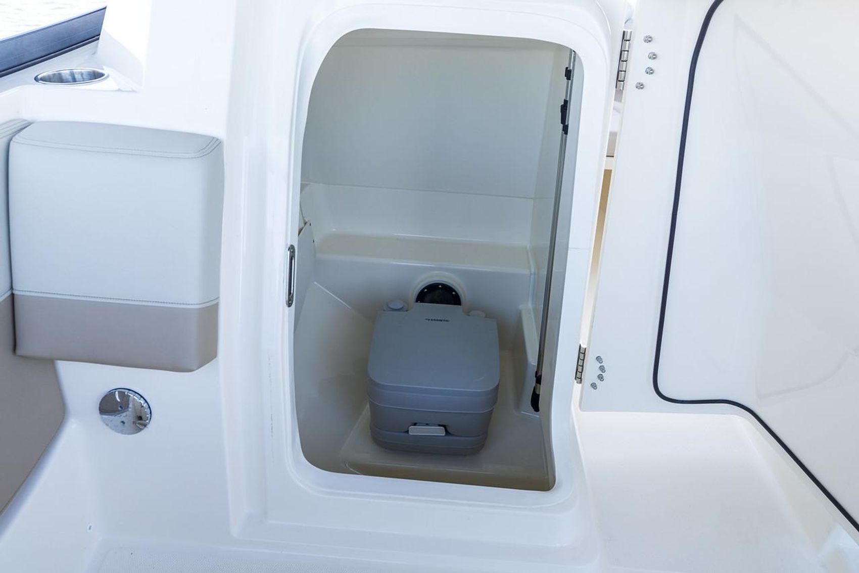 - Convenient portable head in the portside storage compartment