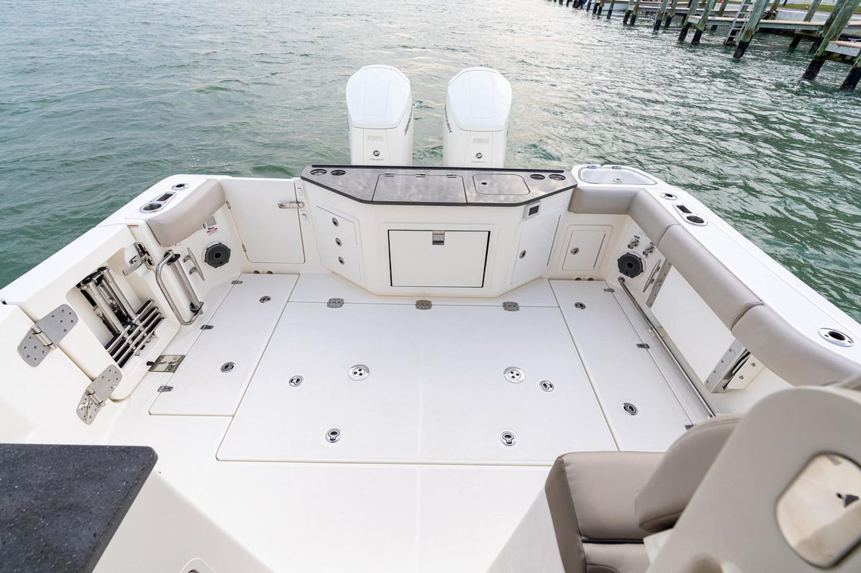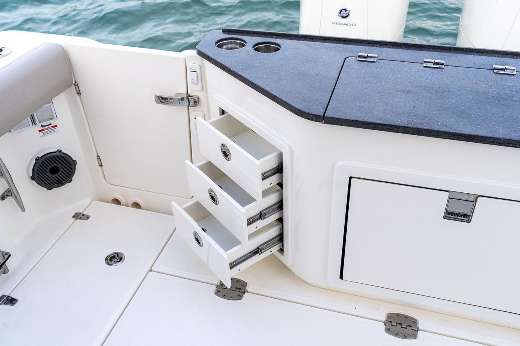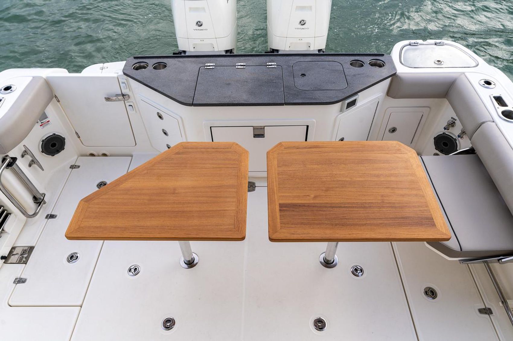 - Boarding door – Molded fiberglass boarding/dive door, starboard side with removable telescoping stainless-steel dive ladder with dedicated storage in dive door and flip out re-boarding grab rail