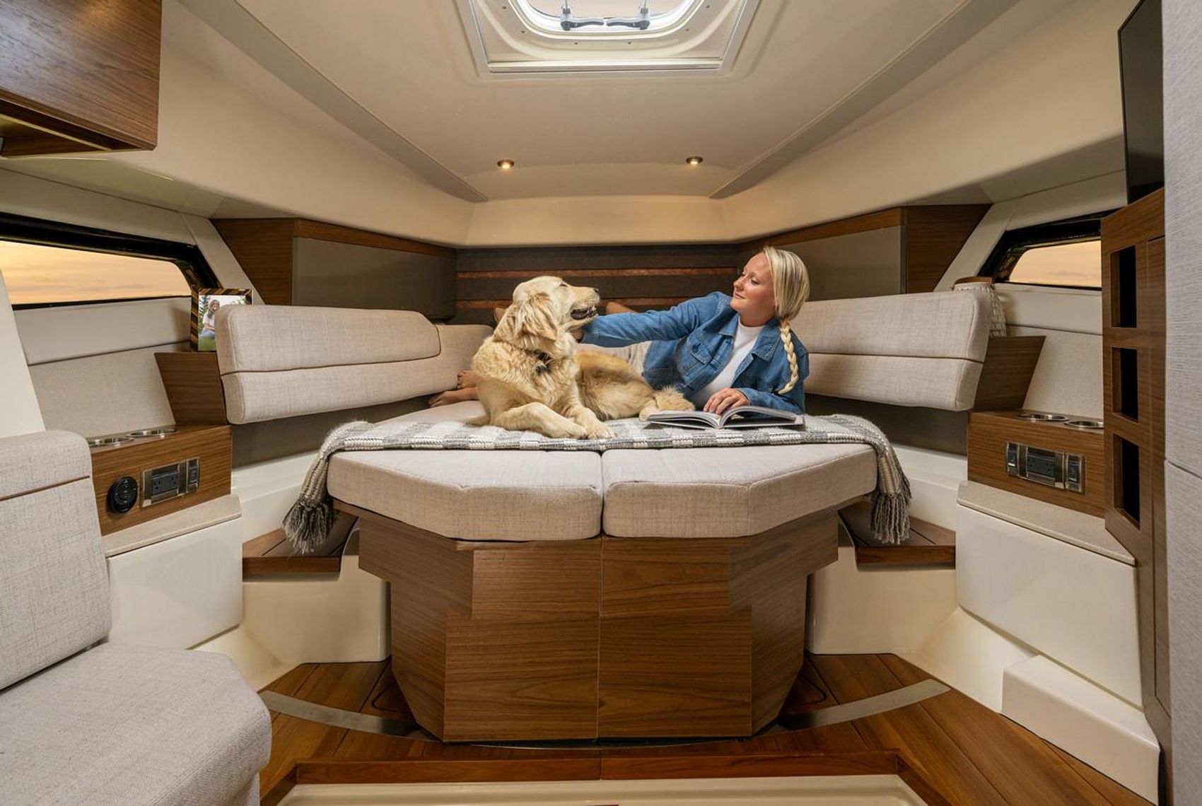 - Cockpit wet bar – includes hot/cold faucet with stowable dual purpose cutting board/work surface sink cover