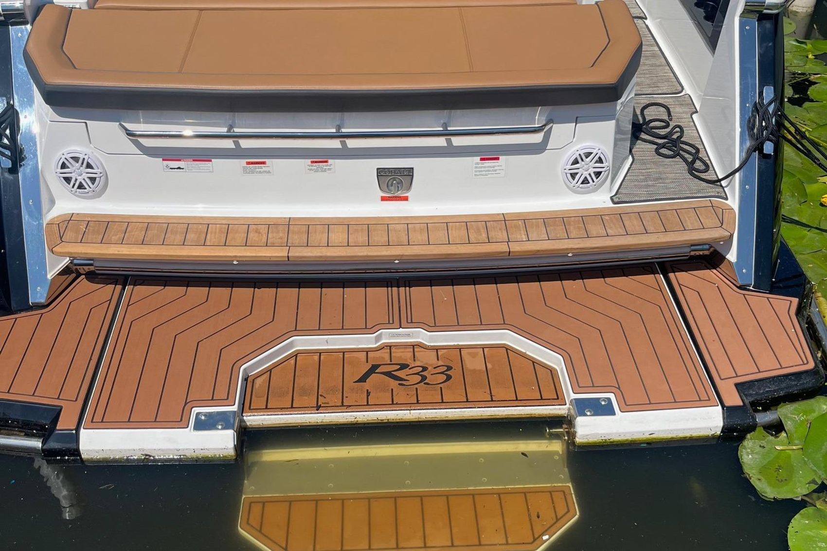 Manufacturer Provided DescriptionThe R33 combines classic styling with innovative geometry, giving it a commanding presence on the water. Stainless steel accents are like jewelry for your boat, and a hydraulic swim platform with a patented mechanical Swim Step offers effortless access to the water. Finely tailored upholstery, expansive seating with modern amenities, thoughtful stowage, an ergonomic helm with digital dual Garmin Glass Cockpit touchscreens—all can be found within the R33. Plus, an all-new marine sound system from Harmon Kardon and highly anticipated Seakeeper innovation that eliminates 95% of boat roll create a truly standout ride. Â