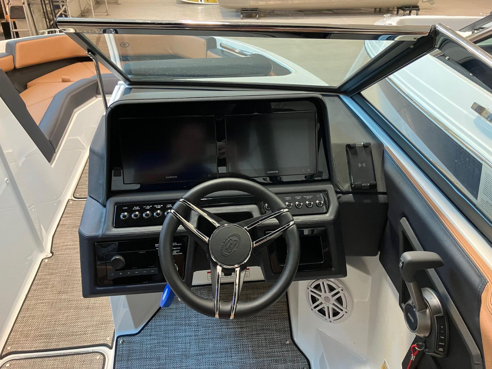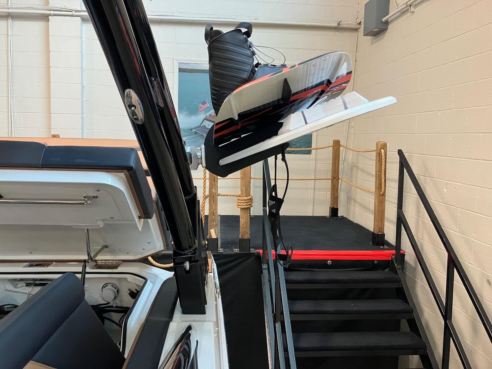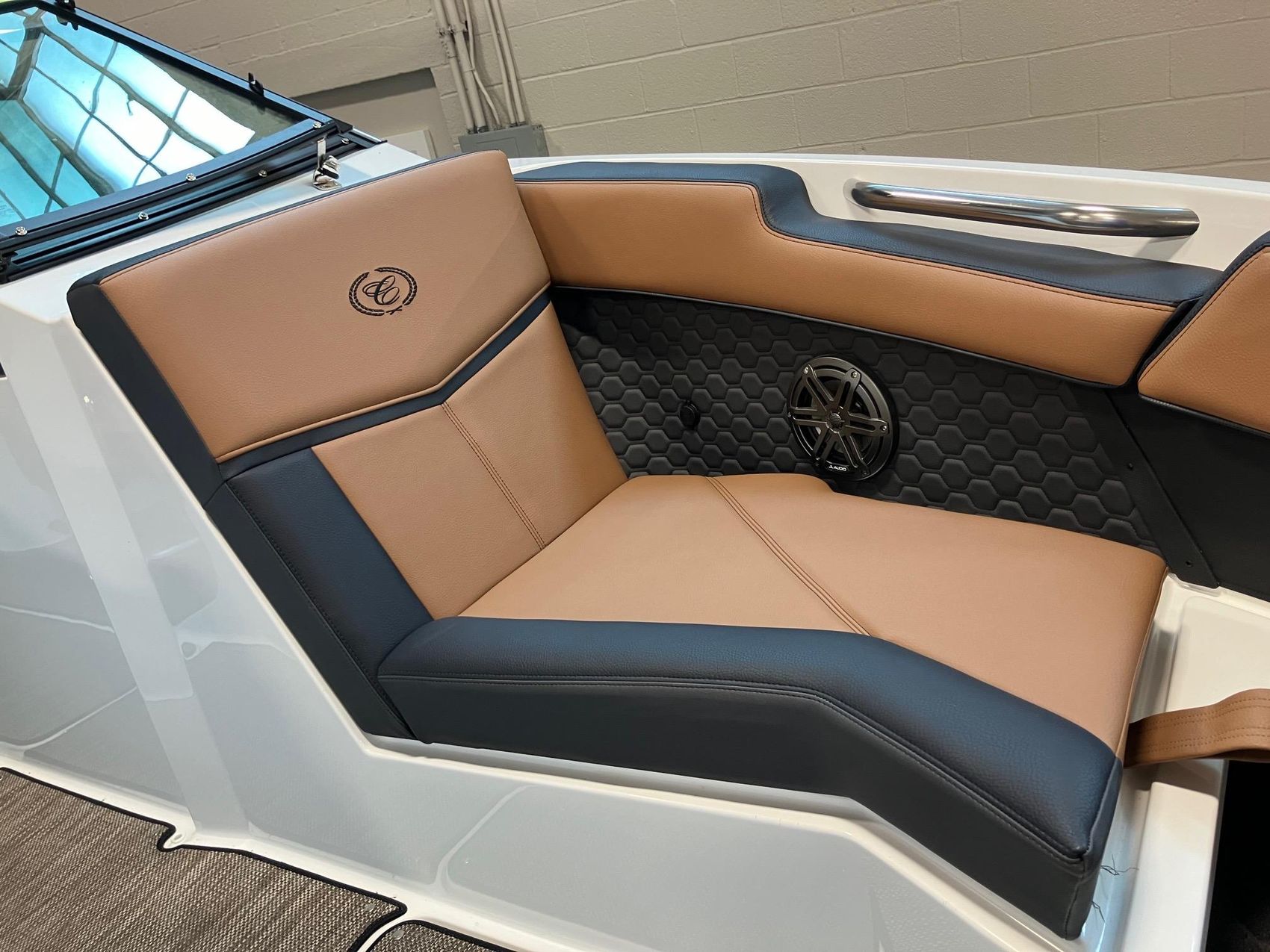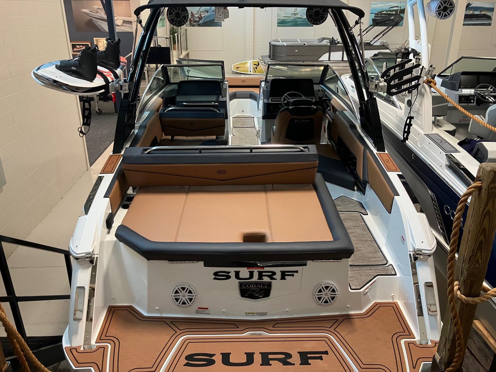 The 2024 Cobalt R4 Surf is a standout ride designed for watersports enthusiasts. It features Cobalt’s Custom Wave Technology surf system with multiple hard ballast tanks, a Volvo FWD powertrain, and a specifically redesigned surf hull that integrates with their best-in-class Surf Gate™ technology. The swim step lowers below the waterline for easy access, and the interior boasts sleek lines and dual Garmin Glass Cockpit touchscreens.