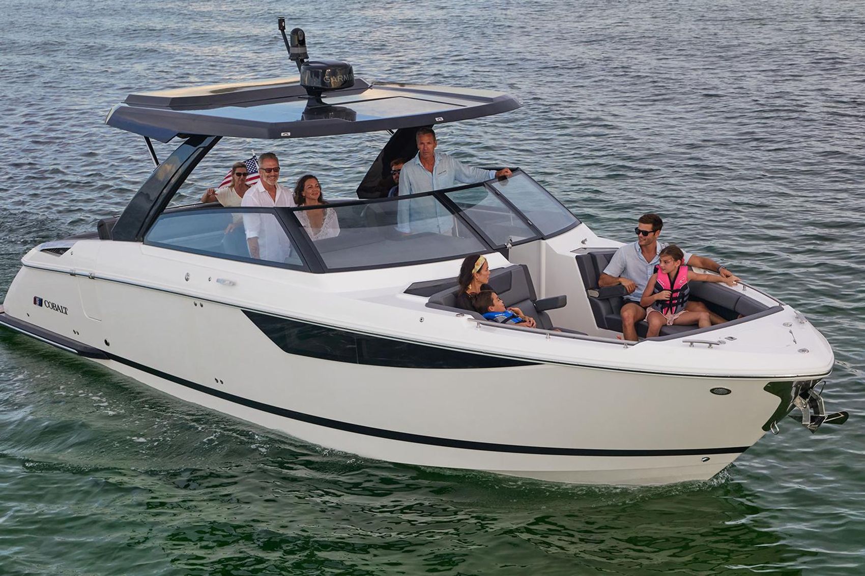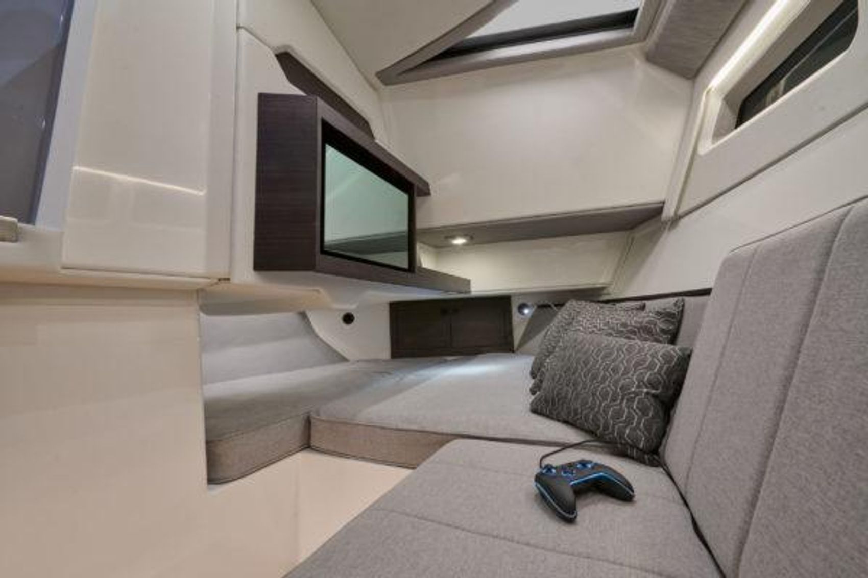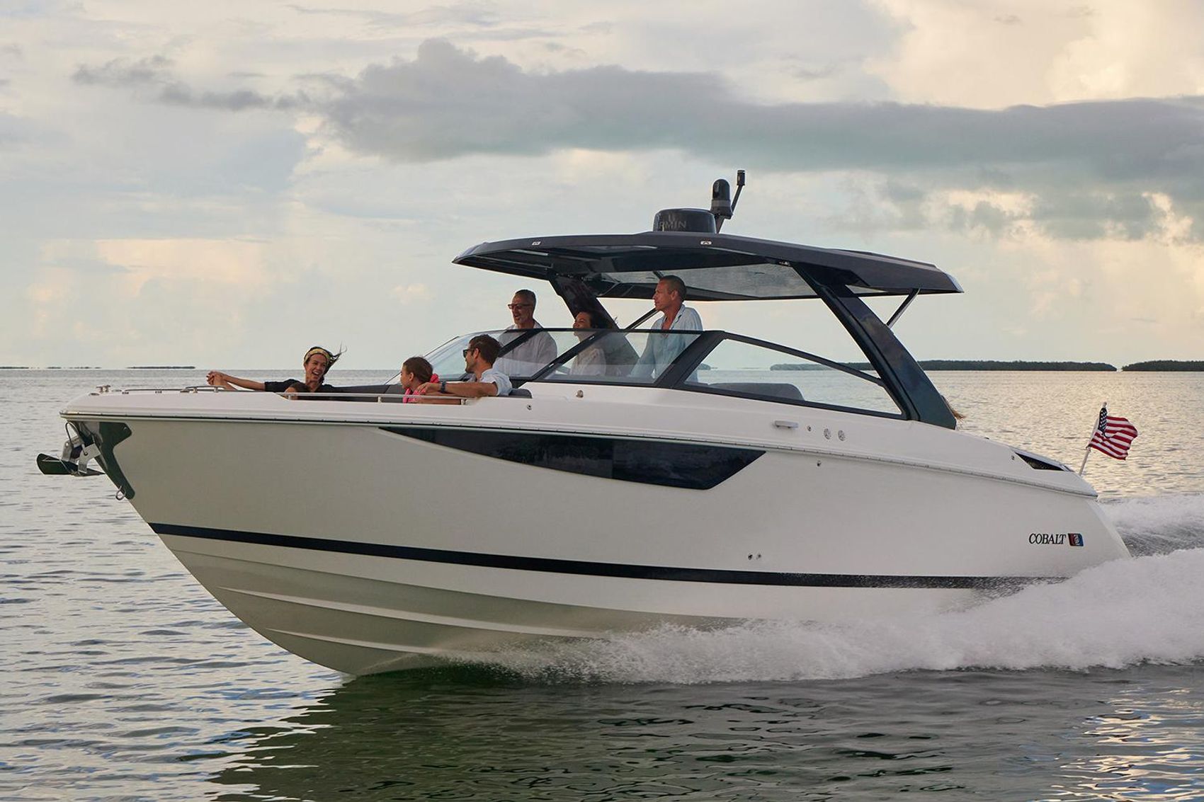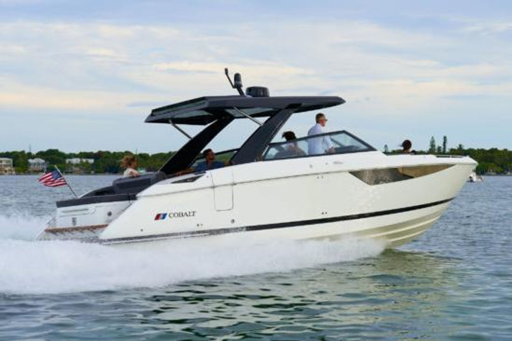 Continuing the Cobalt theme of luxury materials and unmistakable quality, the R35’s finely tailored upholstery covers an enormous amount of seating in an array of modern colors and textures from stem to stern. The ergonomic helm features dual Garmin glass cockpit touchscreens, while the passenger area offers such amenities as a stowable oversize teak table and an ingenious Freezer/Fridge combo unit that gives you both functions in one space-saving package.