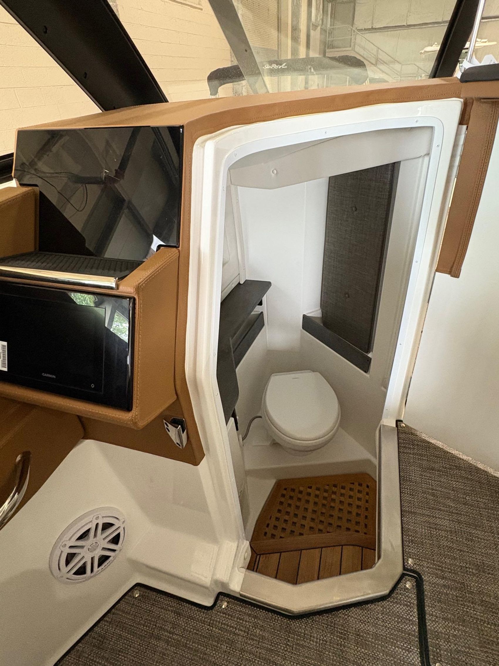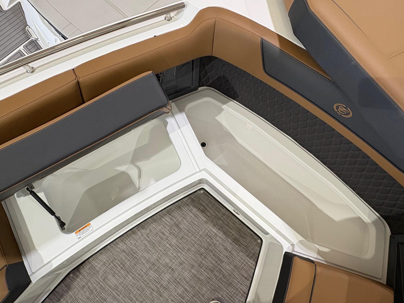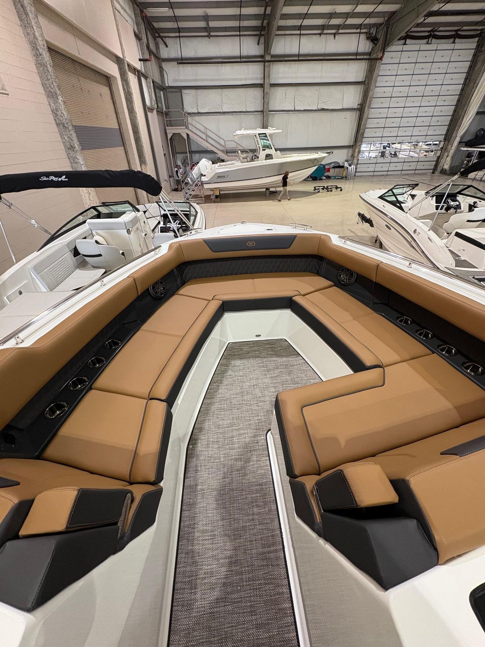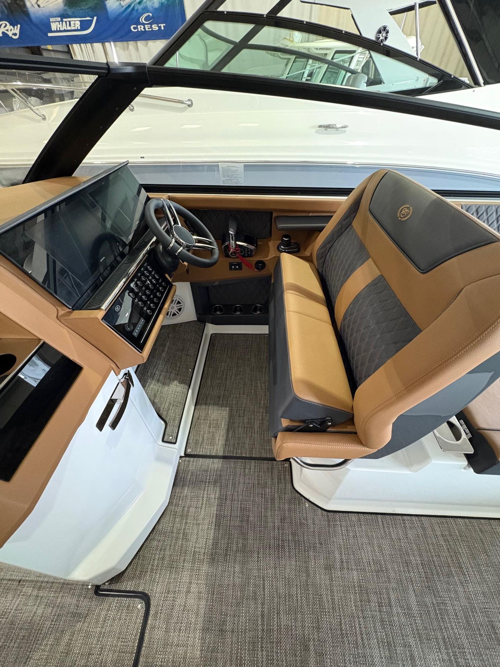 Continuing the Cobalt theme of luxury materials and unmistakable quality, the R35’s finely tailored upholstery covers an enormous amount of seating in an array of modern colors and textures from stem to stern. The ergonomic helm features dual Garmin glass cockpit touchscreens, while the passenger area offers such amenities as a stowable oversize teak table and an ingenious Freezer/Fridge combo unit that gives you both functions in one space-saving package.