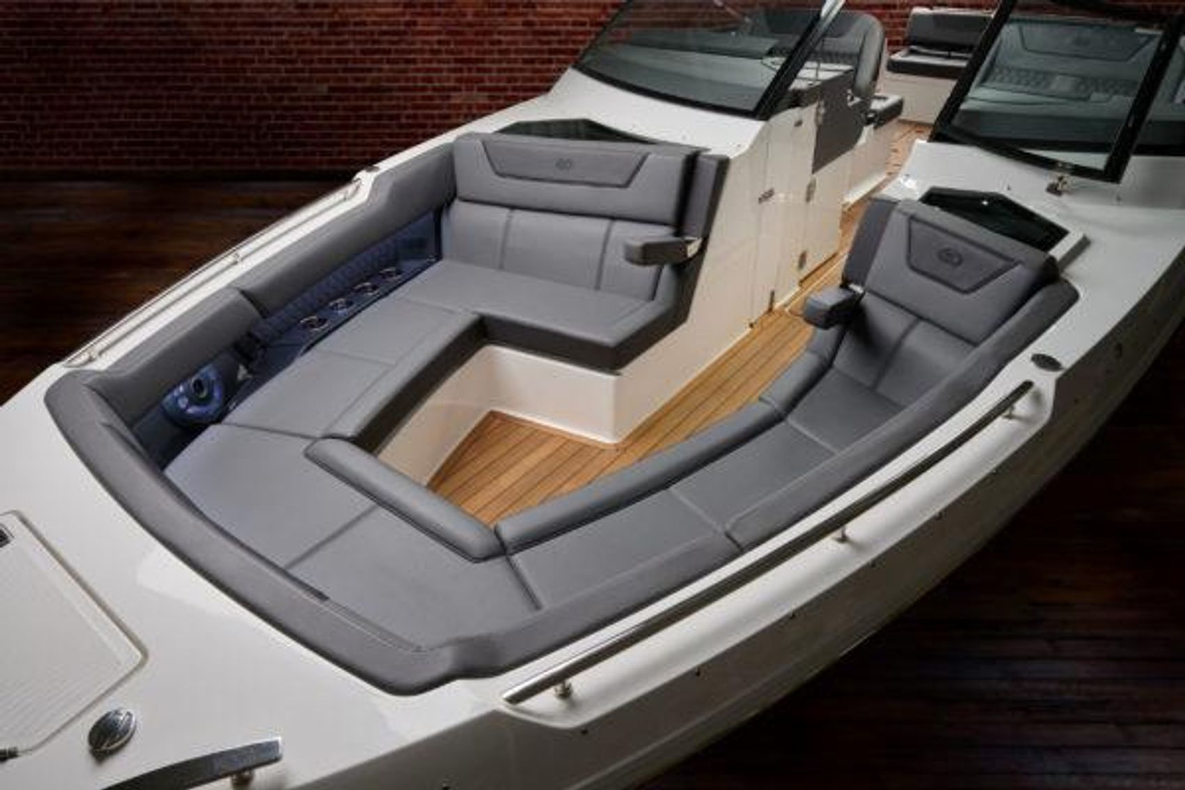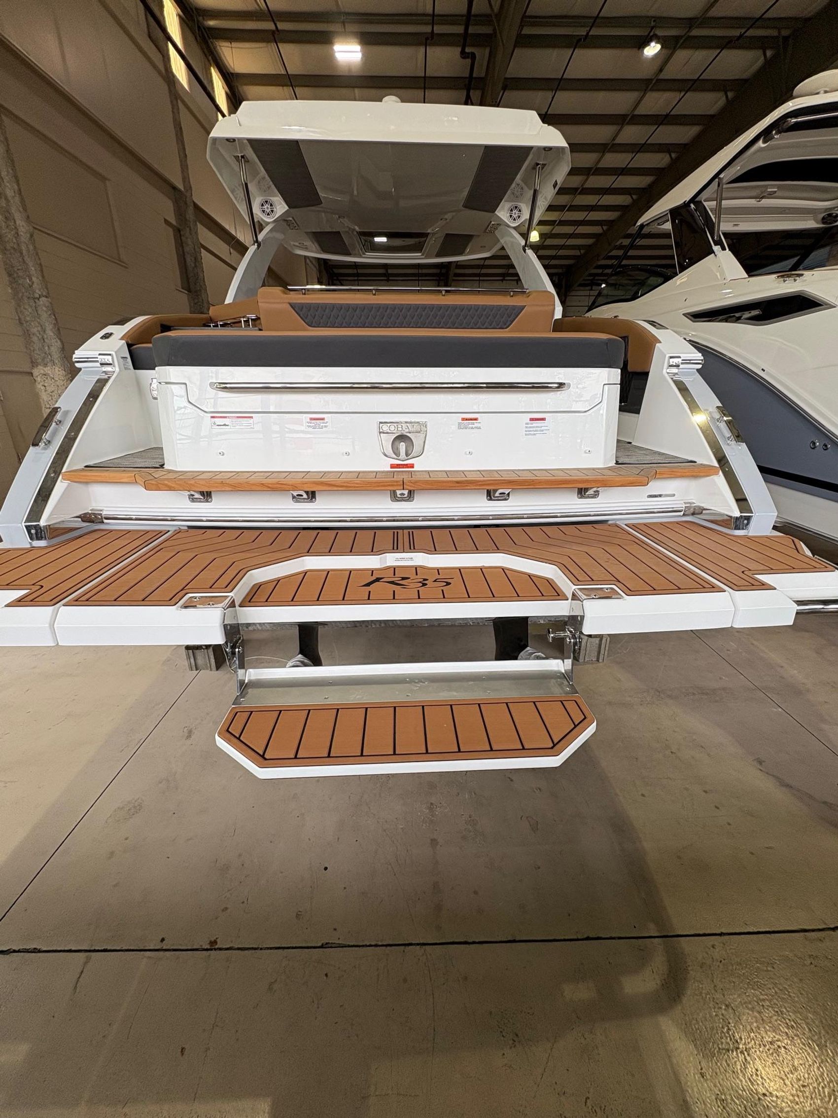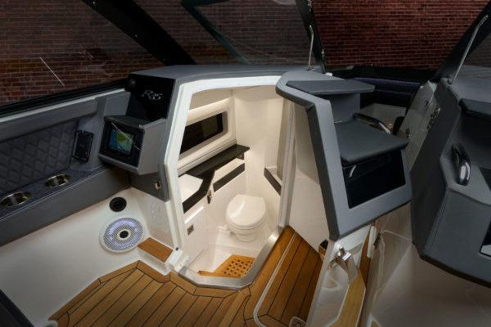 The largest member of the R Series, the R35 maintains the elegantly sleek lines and innovative geometry of the series while displaying a strikingly noticeable presence. Its added room makes the R35 the ideal platform for a number of exciting innovations, including Helm Watch, offering passengers access to charts and cabin controls, and a space-saving, pop-up galley that deploys at the touch of a button. Great for water activities, the entire full-width swim platform lowers below the water hydraulically with the push of a button, offering easy access in or out of the water and into the boat.
