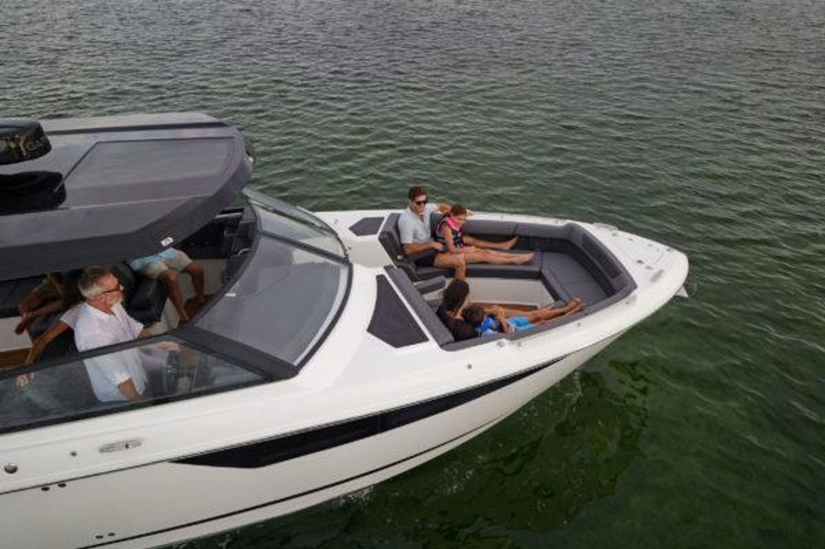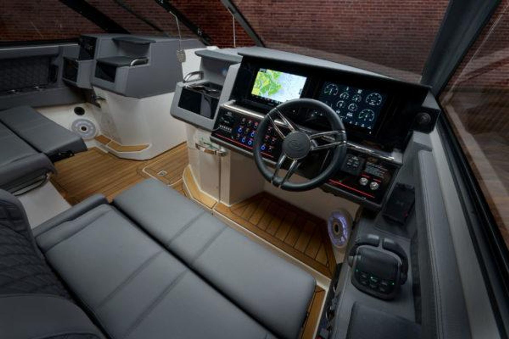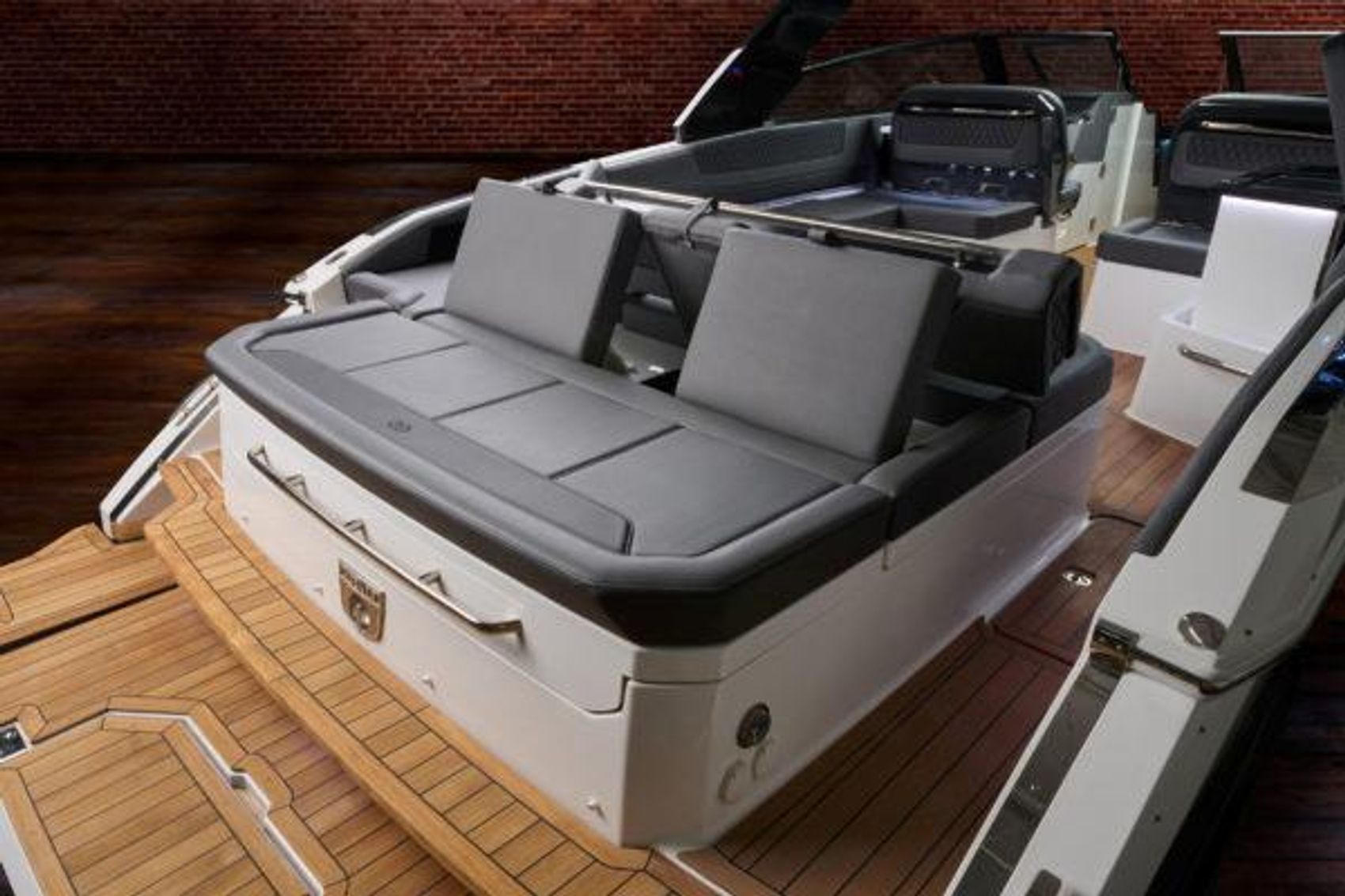 The largest member of the R Series, the R35 maintains the elegantly sleek lines and innovative geometry of the series while displaying a strikingly noticeable presence. Its added room makes the R35 the ideal platform for a number of exciting innovations, including Helm Watch, offering passengers access to charts and cabin controls, and a space-saving, pop-up galley that deploys at the touch of a button. Great for water activities, the entire full-width swim platform lowers below the water hydraulically with the push of a button, offering easy access in or out of the water and into the boat.