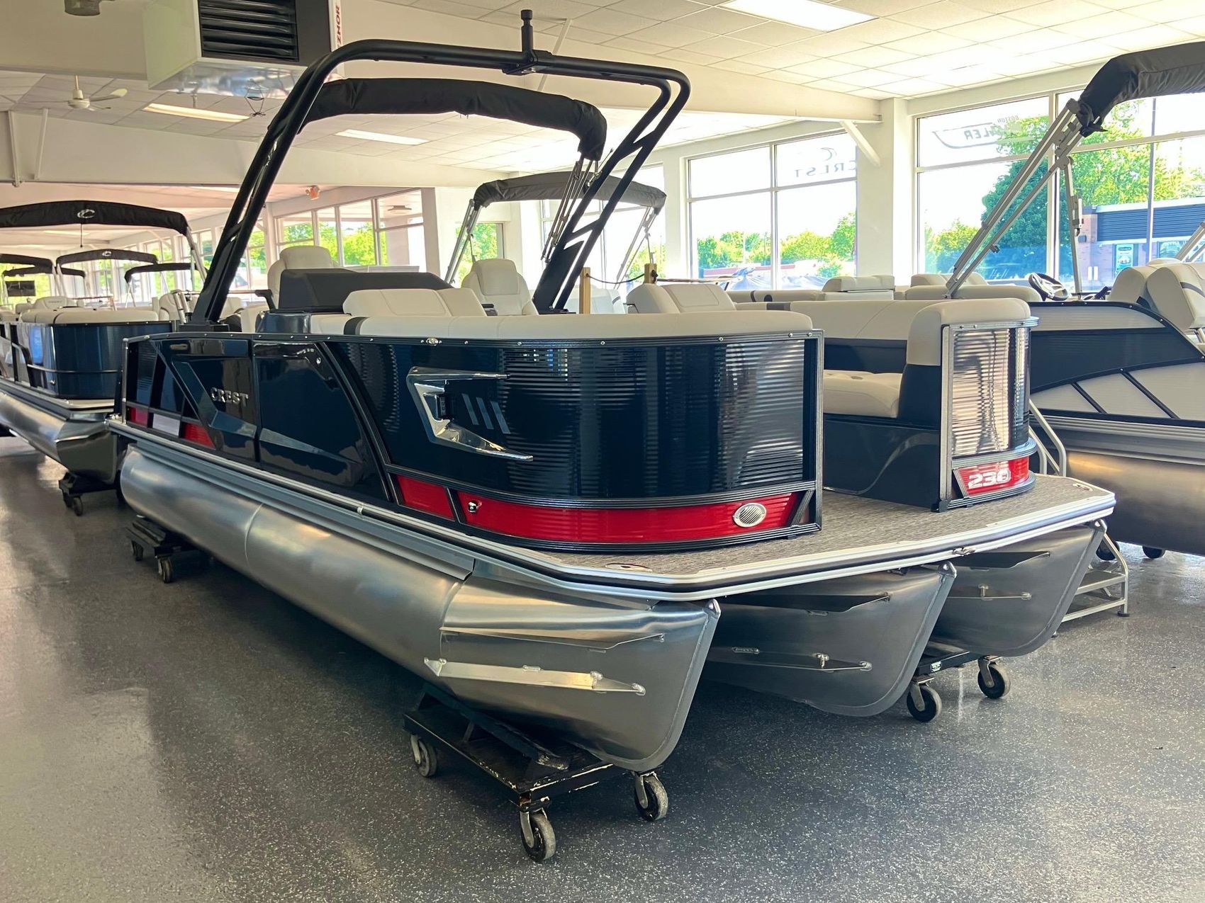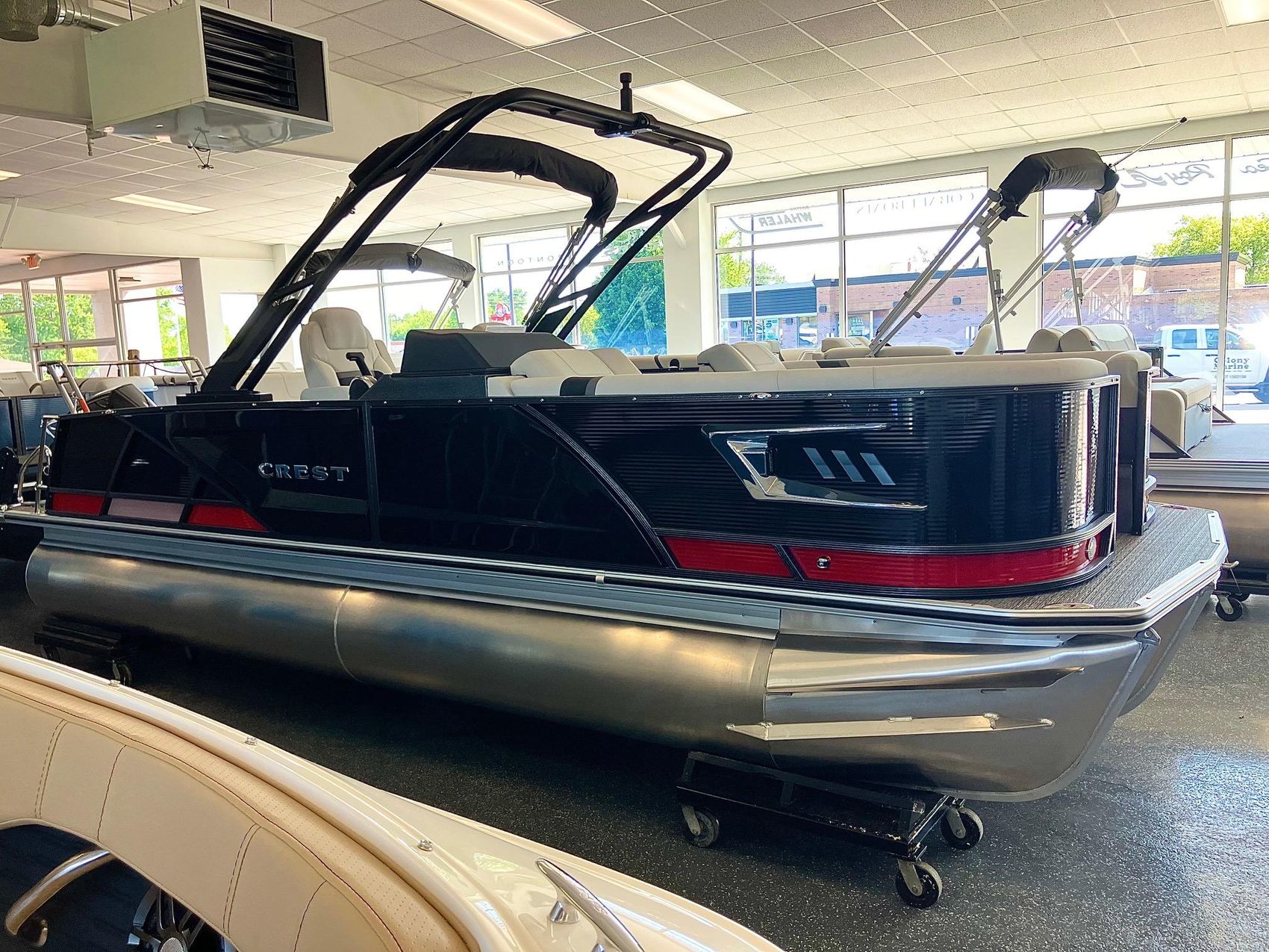 The Crest Marine 230 Caribbean SLS RS is a pontoon vessel that combines entertainment features with agile handling. Its powder-coated perimeter fencing features a dramatic flare aft, complemented by an optional clad tower overhead. The molded accent on the fence lights up, as do the interior speakers in various shades. The helm showcases a billet aluminum dash with aircraft-style lighted toggles. Passengers can stretch out on the 7-foot parallel lounges, and the seat bases are sleek, molded fiberglass. The 250 SLS model features Crest’s CP3 Performance Package, including twin 25-inch outer tubes around a central 26-inch tube pontoon dropped 1 inch to create a V-hull effect.