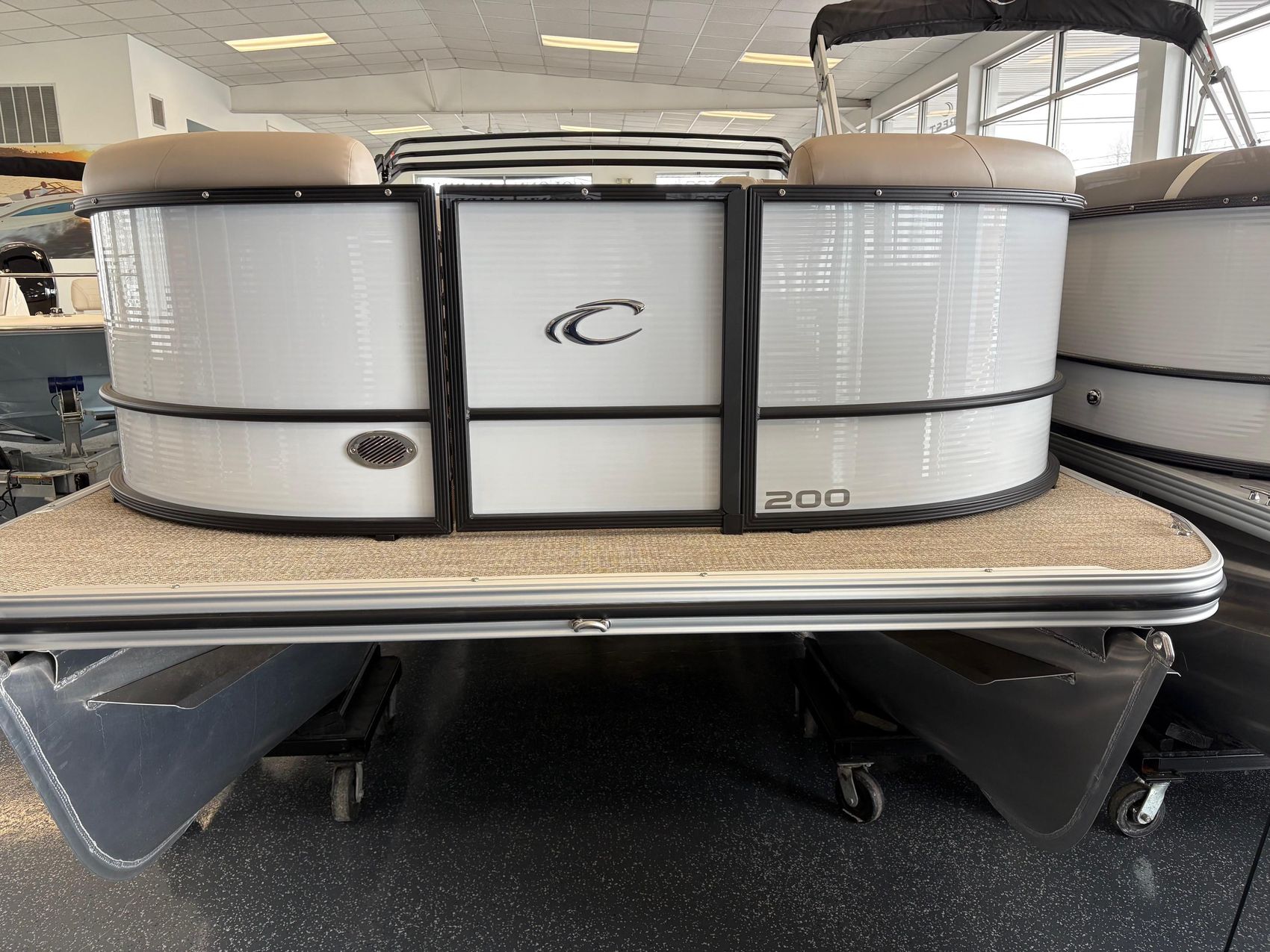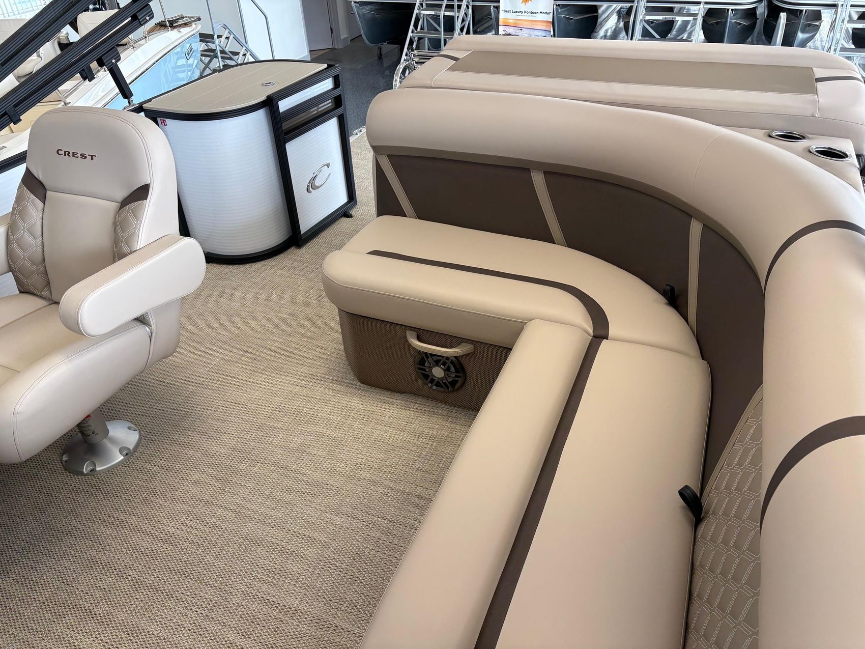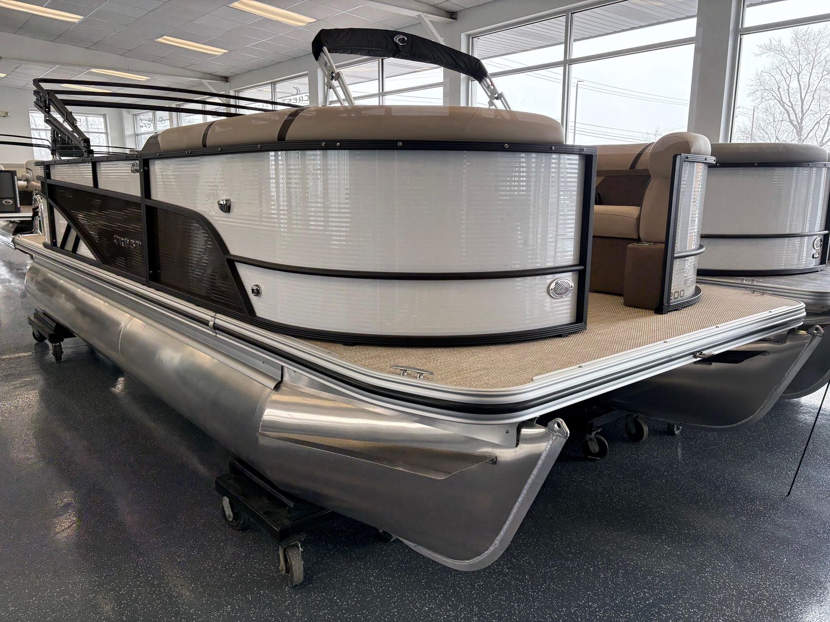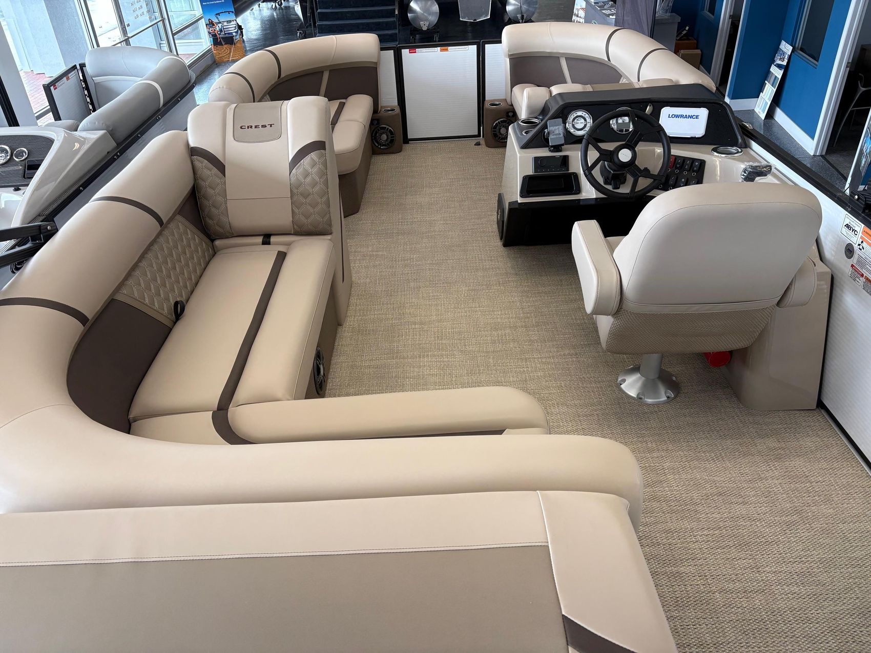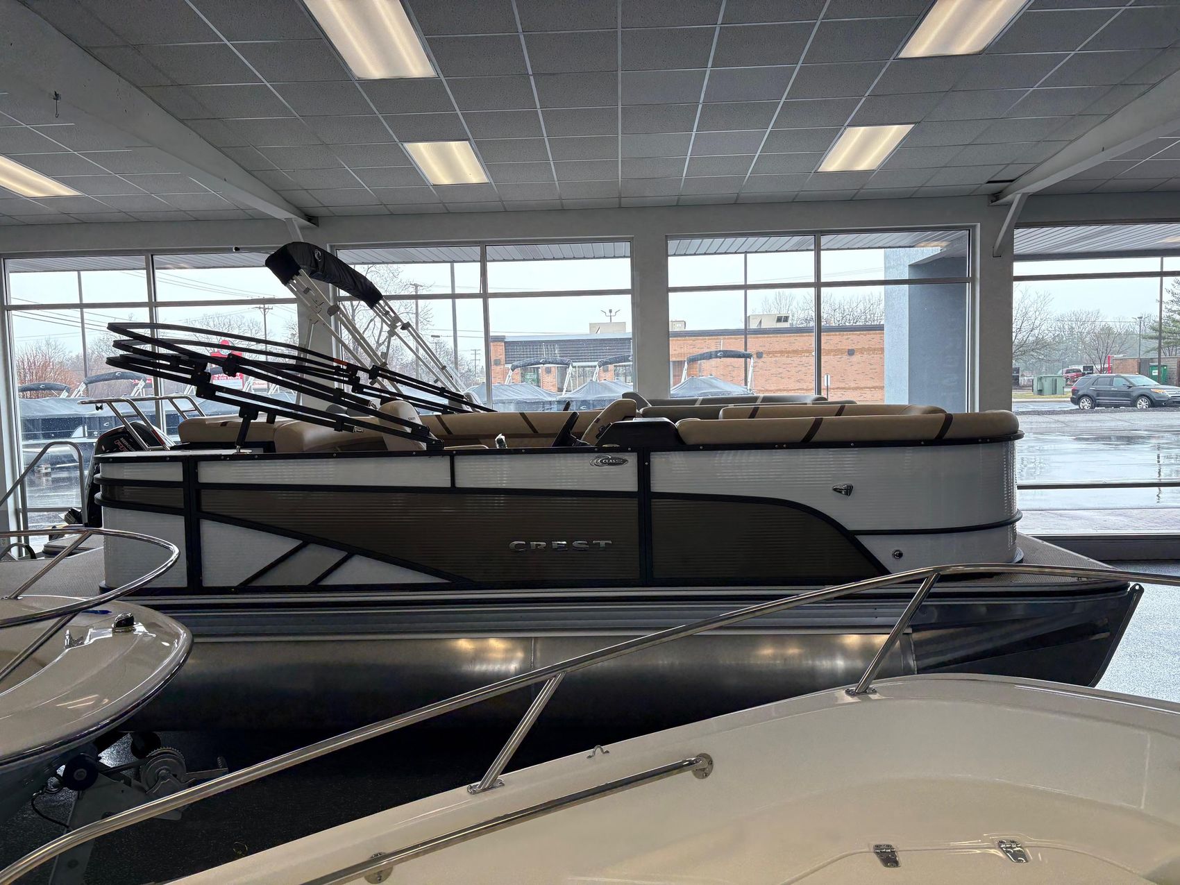 The 2025 Crest Marine 200L Classic LX pontoon boat is designed for both comfort and performance, making it an excellent choice for family outings and leisurely cruises. This model features spacious seating with L-shaped sun pads, dual captain’s chairs, and swing-back loungers, ensuring ample room for up to 10 passengers. Equipped with modern amenities like USB phone chargers and a Fusion audio system, it keeps everyone connected and entertained.