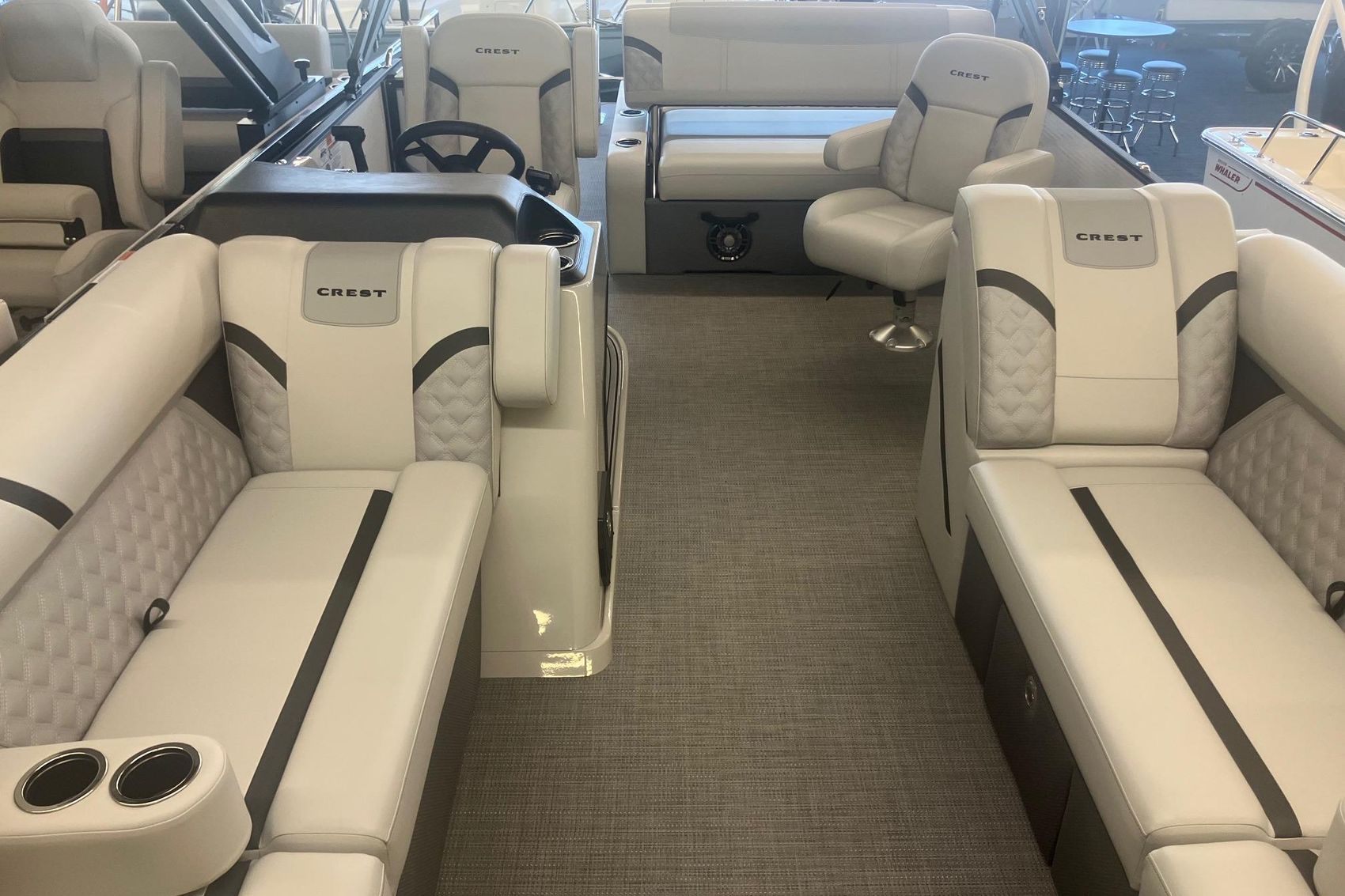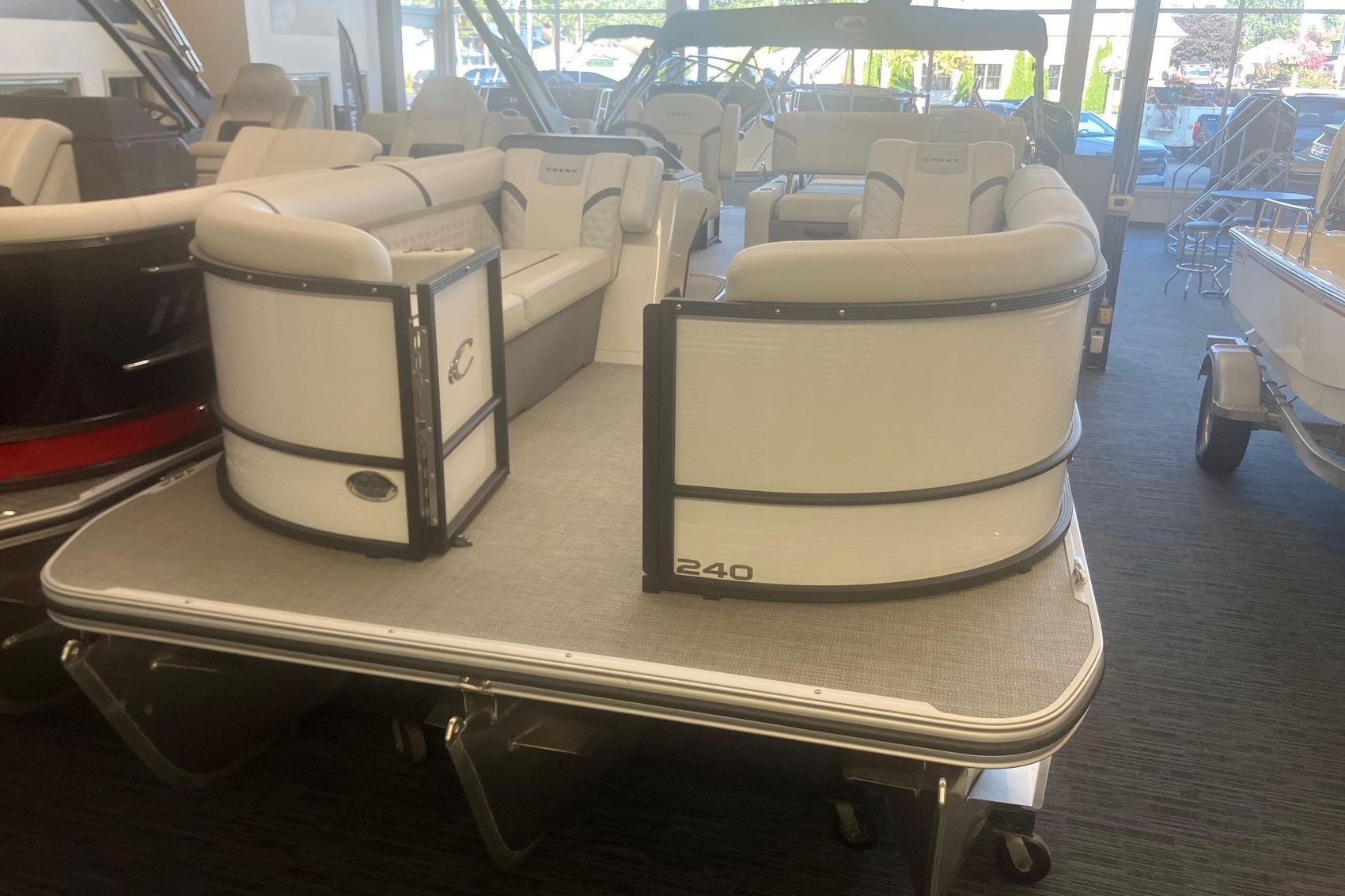 The Crest 240 SLSC Classic LX is a 24-foot pontoon that blends sporty design with versatile comfort, ideal for both laid-back cruising and active days on the water. Its signature swing-back lounge and dual captain’s chairs offer flexible seating, while the raised helmstand and midship entertainment table enhance usability and flow. Built with oversized aluminum pontoons and premium vinyl flooring, it delivers stability and style. Features include a Lillipad ladder, removable oval table, and 5″ Eagle Lowrance GPS touchscreen display, all wrapped in Crest’s sleek, modern aesthetic.
