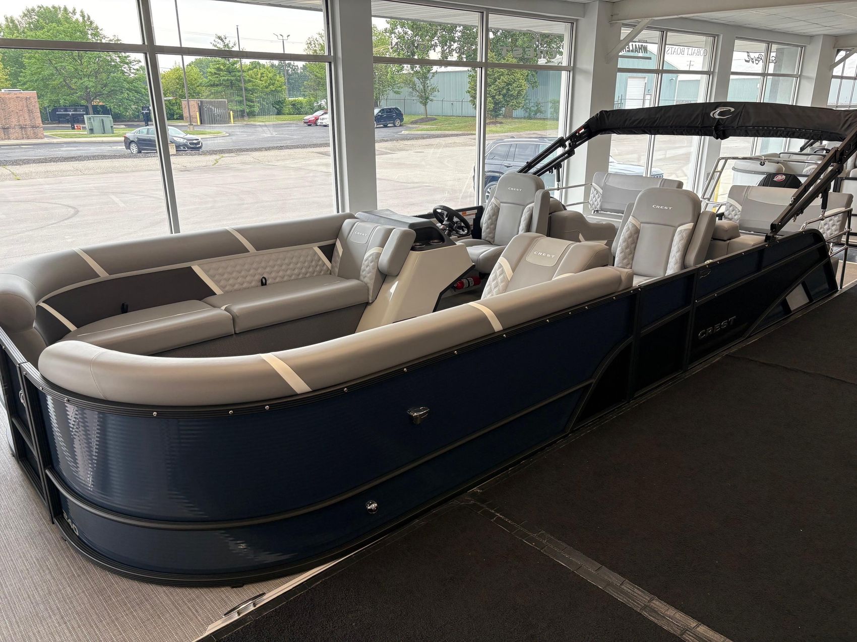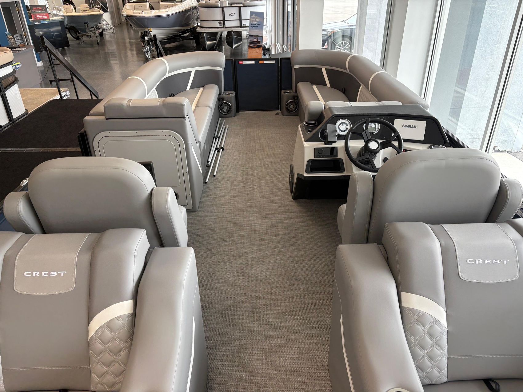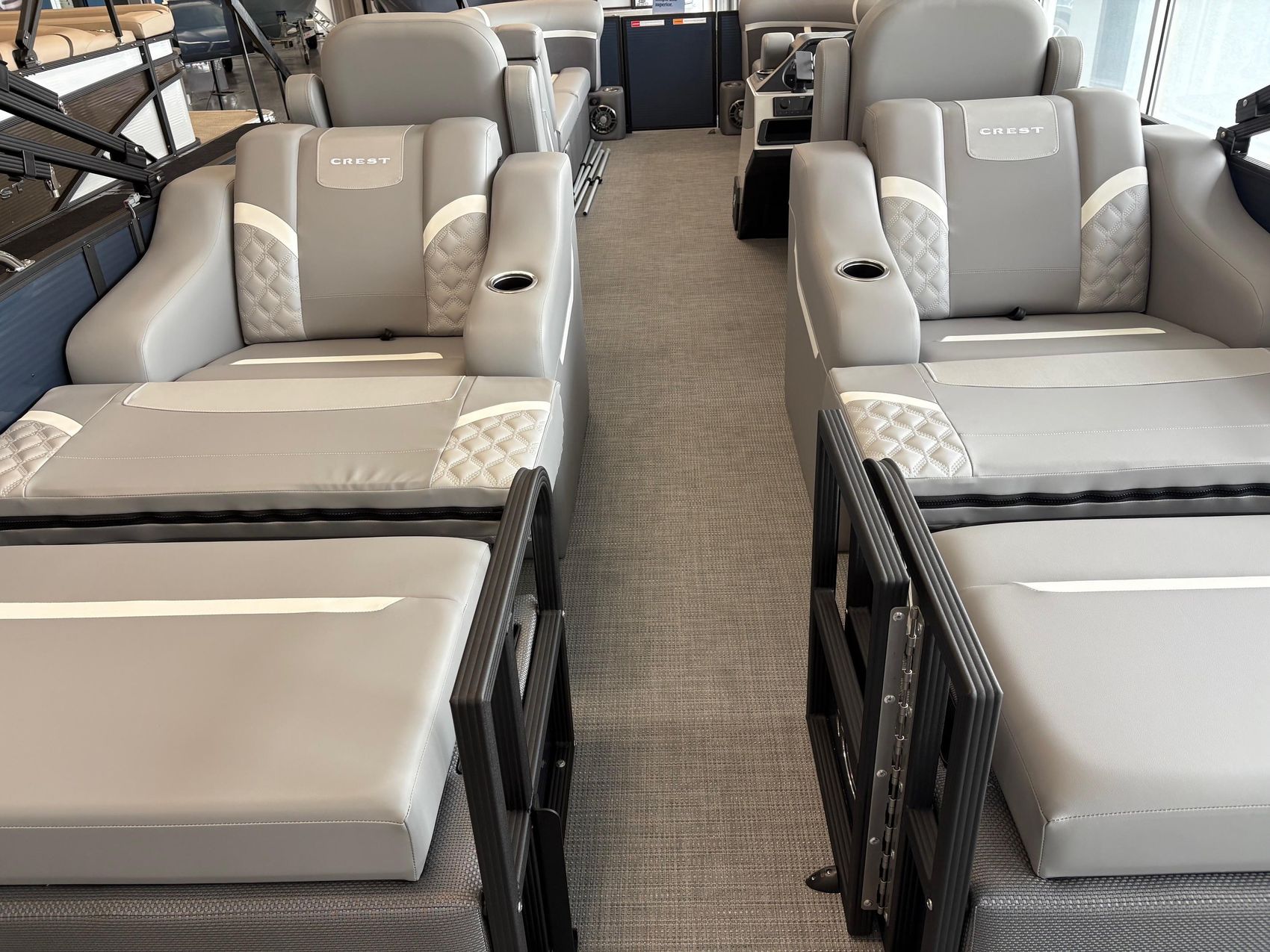 The Crest 240 SLRC Classic LX is a 24-foot tritoon that pairs luxury design with smart functionality for all-day leisure and social cruising. Its standout rear chaise lounge configuration offers relaxed comfort and stylish symmetry, while the dual high-back captain’s chairs and raised helm provide premium seating and intuitive control. Standard features include a SIMRAD touchscreen display, under-deck LED lighting, multiple USB charging stations, and a Lillipad ladder for smooth water access—all wrapped in Crest’s signature sleek aesthetic and durable build quality.