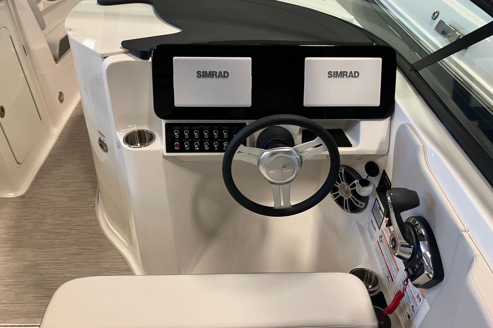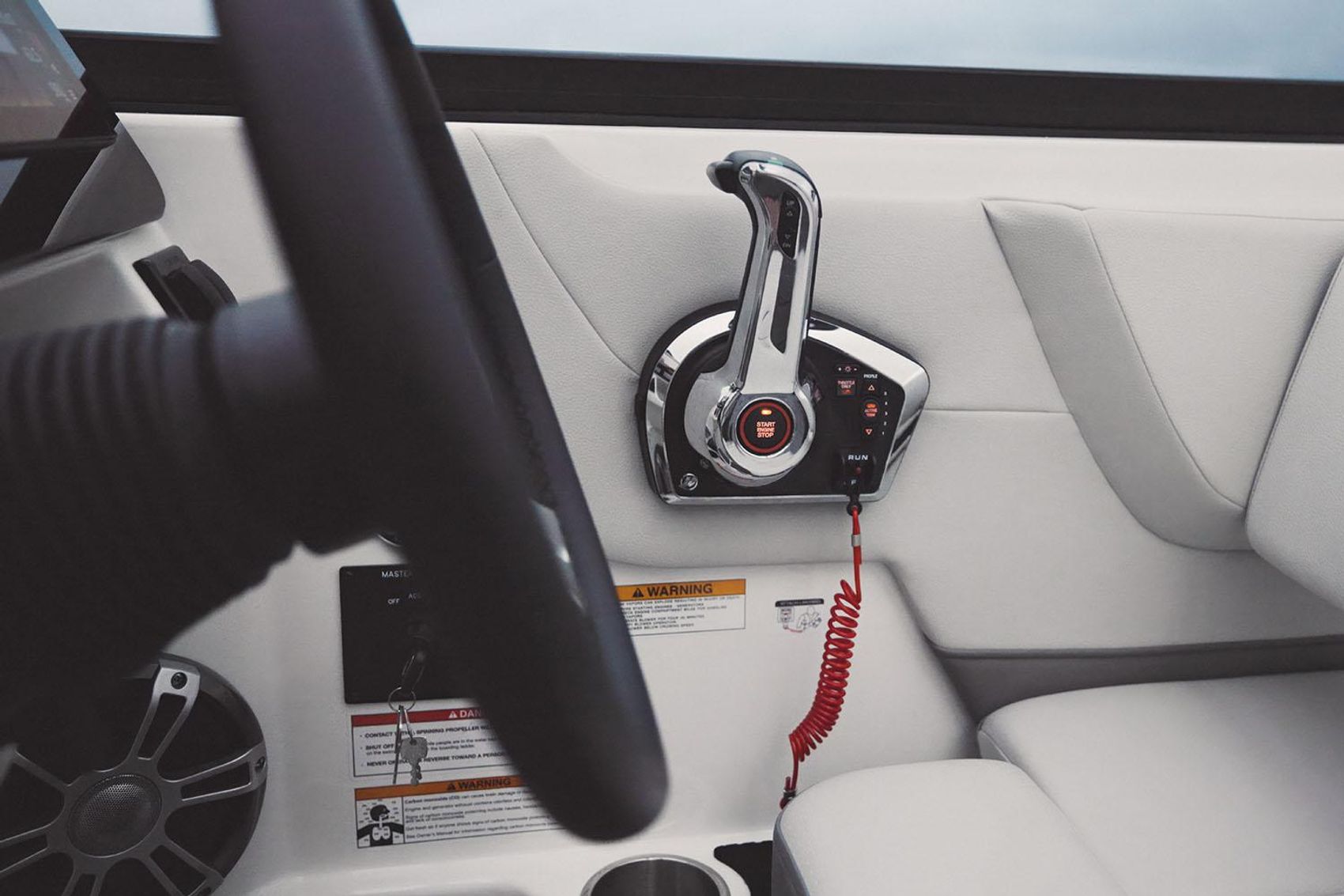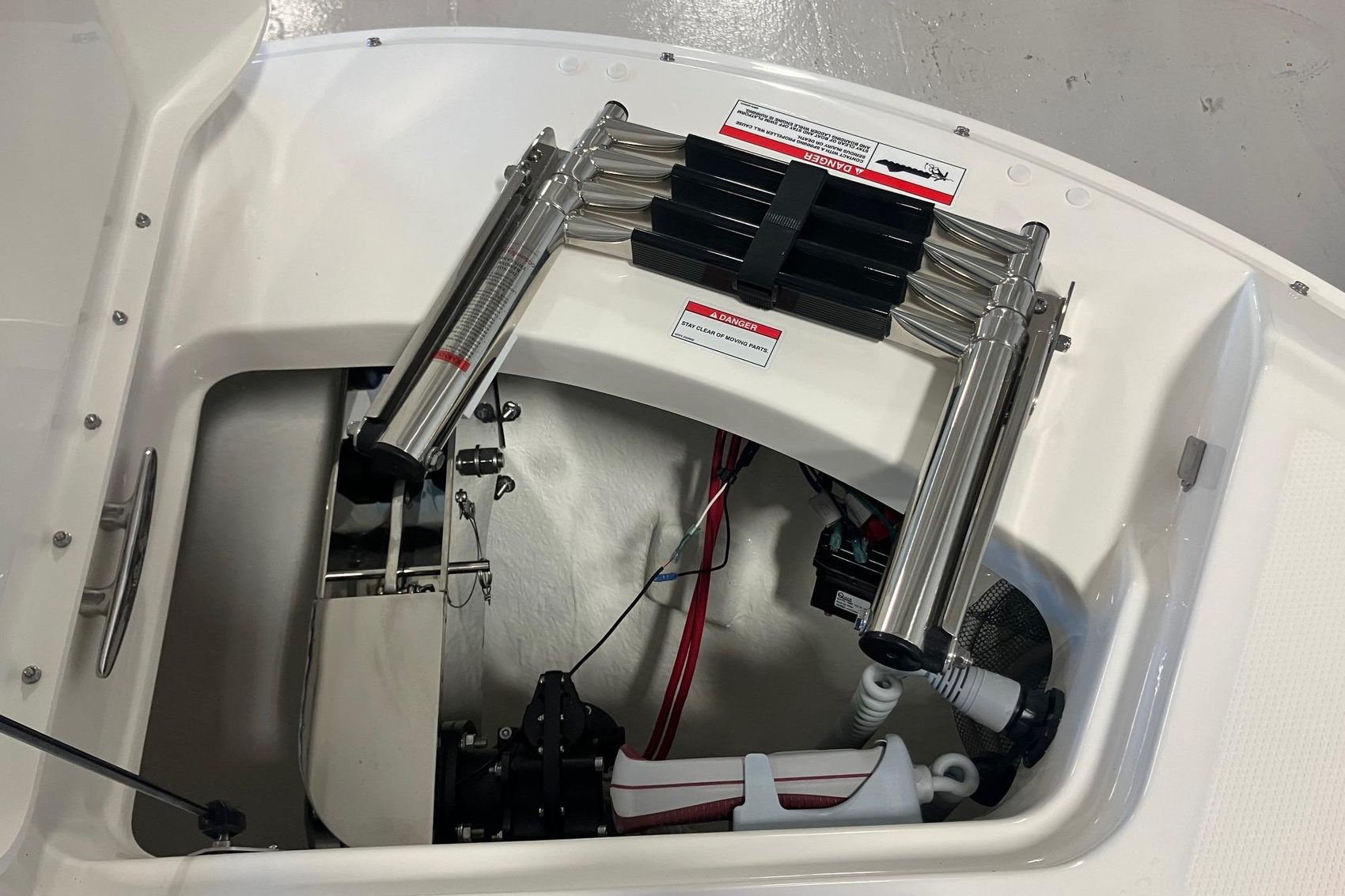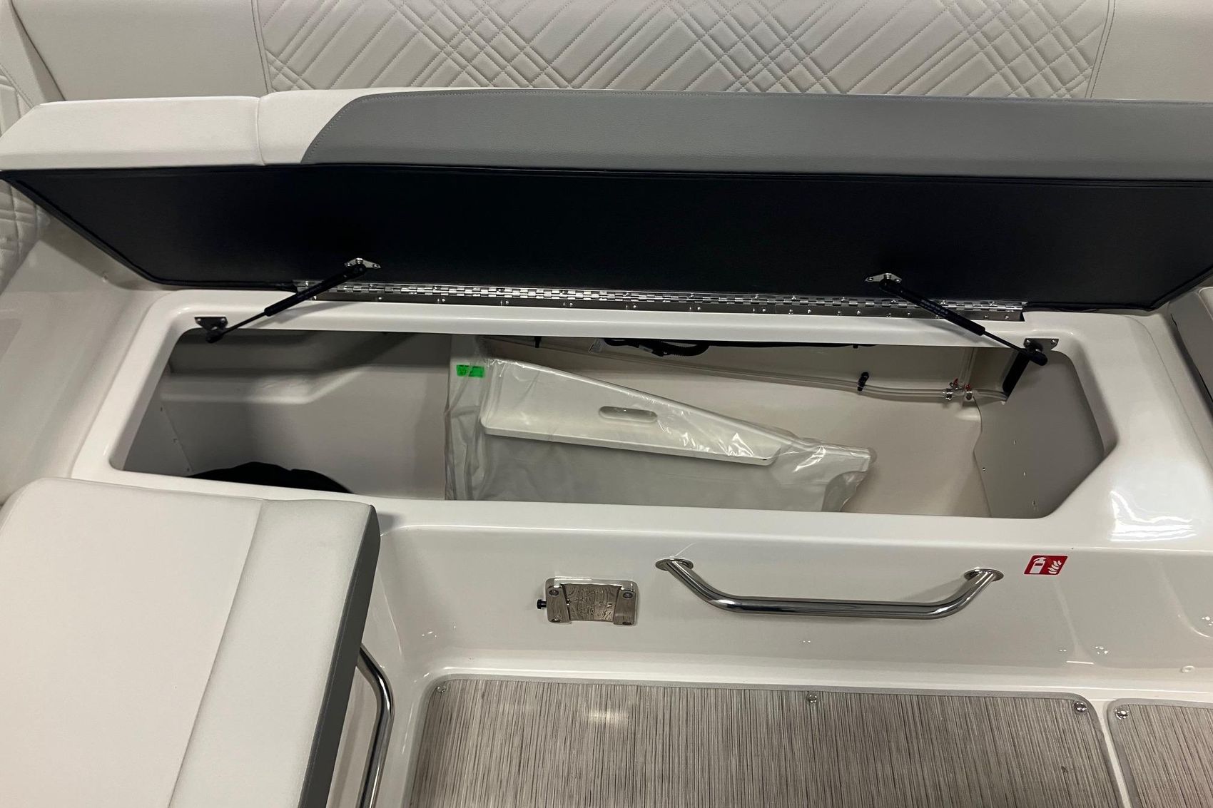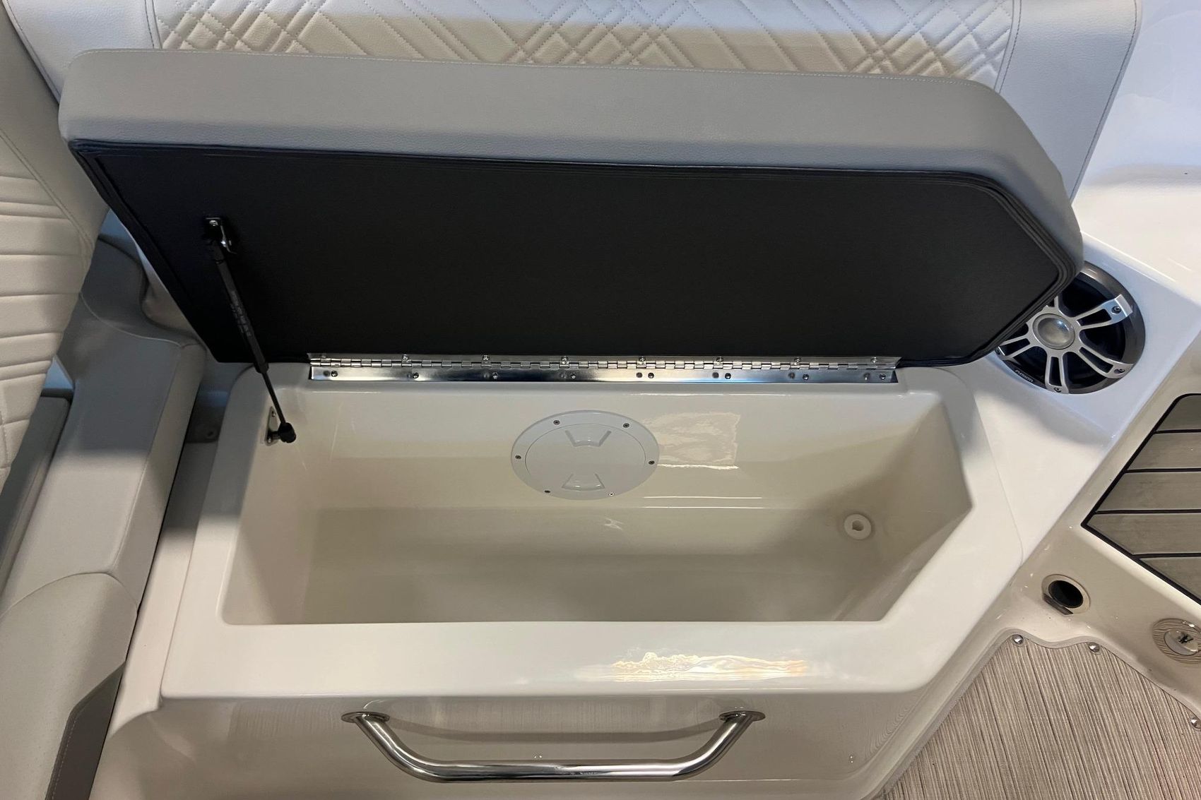 Move seamlessly between the deck and the water with transom-mounted, concealable ladder and optional submersible swim step for swimming and water sports off the back of the boat. Cleverly designed niches for your cooler and watersports gear gives you that oh-so- satisfying feeling of everything fitting neatly in its place. The ample starboard storage space beneath the helm can also be upgraded to include a head.