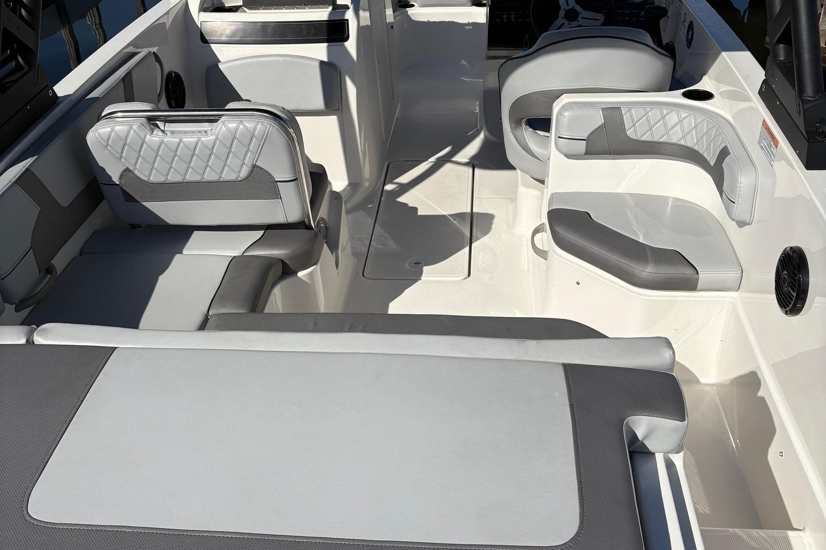 The largest model in our bowrider family, the VR6 is also all about space and unparalleled roominess. It combines Bayliner category-leading BeamForward design and our signature AftAdvantage concept which increases dry seating in the self-draining cockpit by adding the swim platform at the end of the running surface. This boat maximizes space and value like never before regardless of whether you choose outboard or sterndrive power. You will also find pleasant surprises like a lockable enclosed changing room (head optional) and aft-facing companion observer seat that is ideal for water sports and with the addition of a filler cushion creates a comfortable U-lounge that turns the whole aft section into an inviting gathering area.