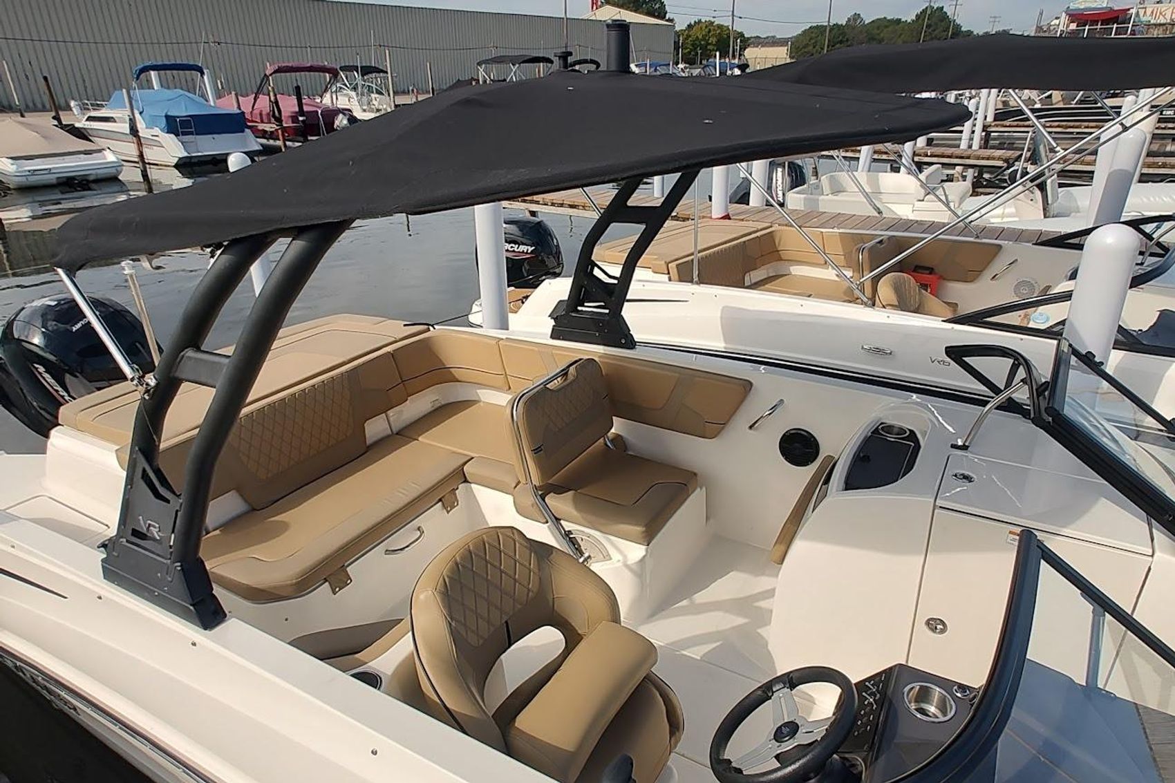 The largest model in our bowrider family, the VR6 is also all about space and unparalleled roominess. It combines Bayliner category-leading BeamForward design and our signature AftAdvantage concept which increases dry seating in the self-draining cockpit by adding the swim platform at the end of the running surface. This boat maximizes space and value like never before regardless of whether you choose outboard or sterndrive power. You will also find pleasant surprises like a lockable enclosed changing room (head optional) and aft-facing companion observer seat that is ideal for water sports and with the addition of a filler cushion creates a comfortable U-lounge that turns the whole aft section into an inviting gathering area.
