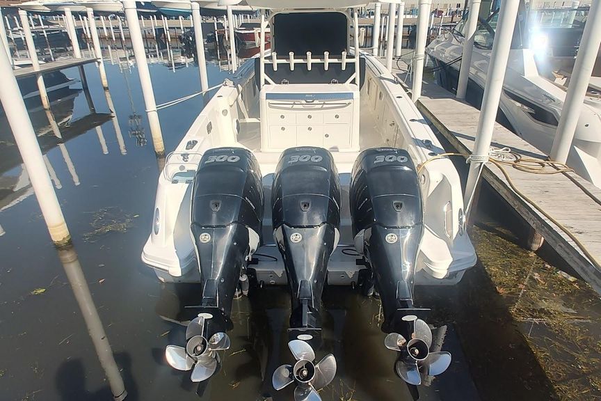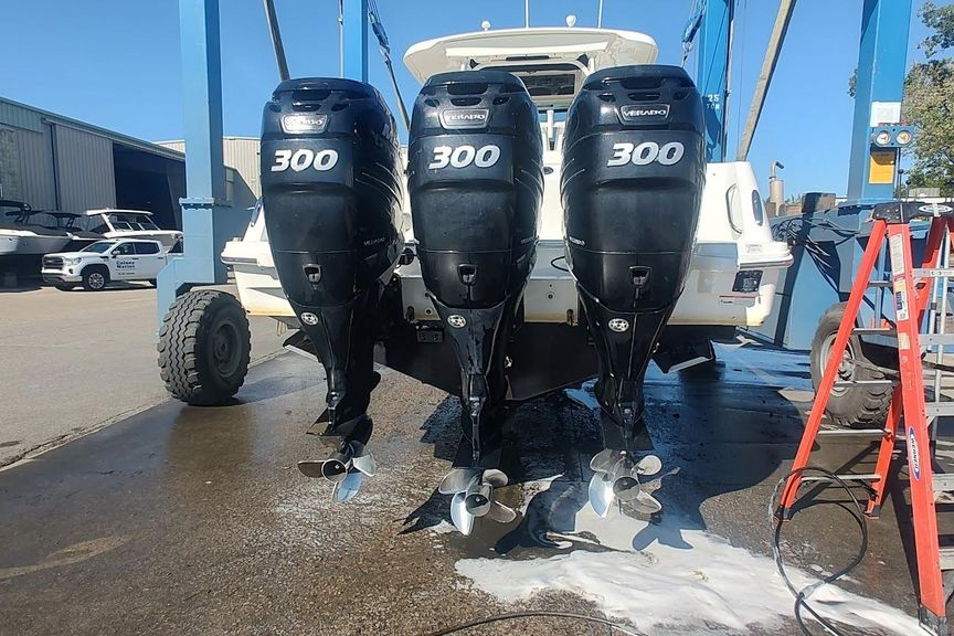 New listing ..Powered with triple 300 Mercury Verados with less than 400 Freshwater dealer maintained hours , Bow Thruster , Dual 15″ Raymarine (Plotter -Fish-finder -Radar , Autopilot , Cockpit Grill with inventor , Electric Sunshade , Fold down trolling seats and Summer kitchen option…