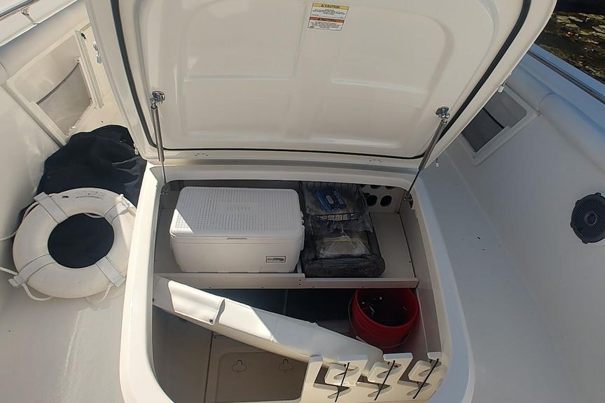 - Pressurized livewell (23 gal) in aft port corner with clear lid and blue interior with red and white LED lights