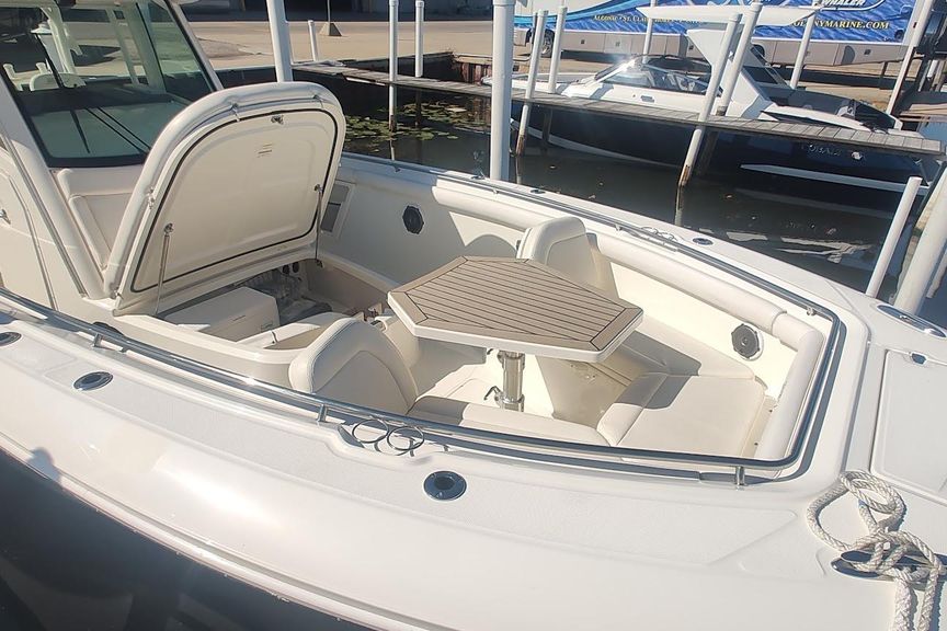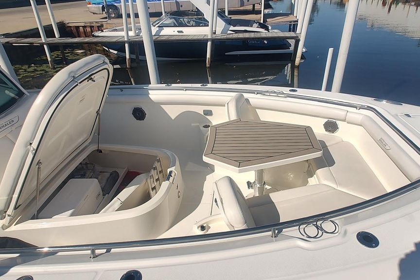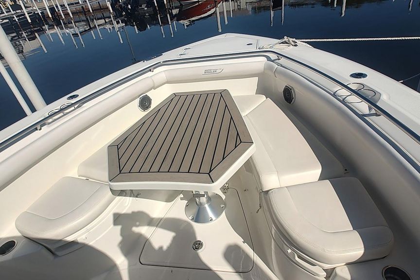 AccommodationsRemarkable capability marries beautifully with thoughtful amenities and cutting-edge technology in the Boston Whaler 350 Outrage. In the spacious cockpit, anglers will appreciate luxury fishing boat features including a deluxe leaning post/bait-prep center with 40-gallon livewell, tackle and tool storage, and freshwater sink with faucet. For entertaining, the optional Summer Kitchen makes hosting a breeze, thanks to an optional grill and fridge, sink and storage. Meanwhile, an optional upper station serves up spectacular views and phenomenal fishing functionality. From bow to stern, ample seating and storage ensure a comfortable ride and a smart, secure place for all your gear. Other premium features include a Sirius-ready Fusion stereo system, triple Mercury Verado FourStroke engines with optional Bow Thruster for effortless docking. On the 350 Outrage, every element combines to produce an exceptional experience.