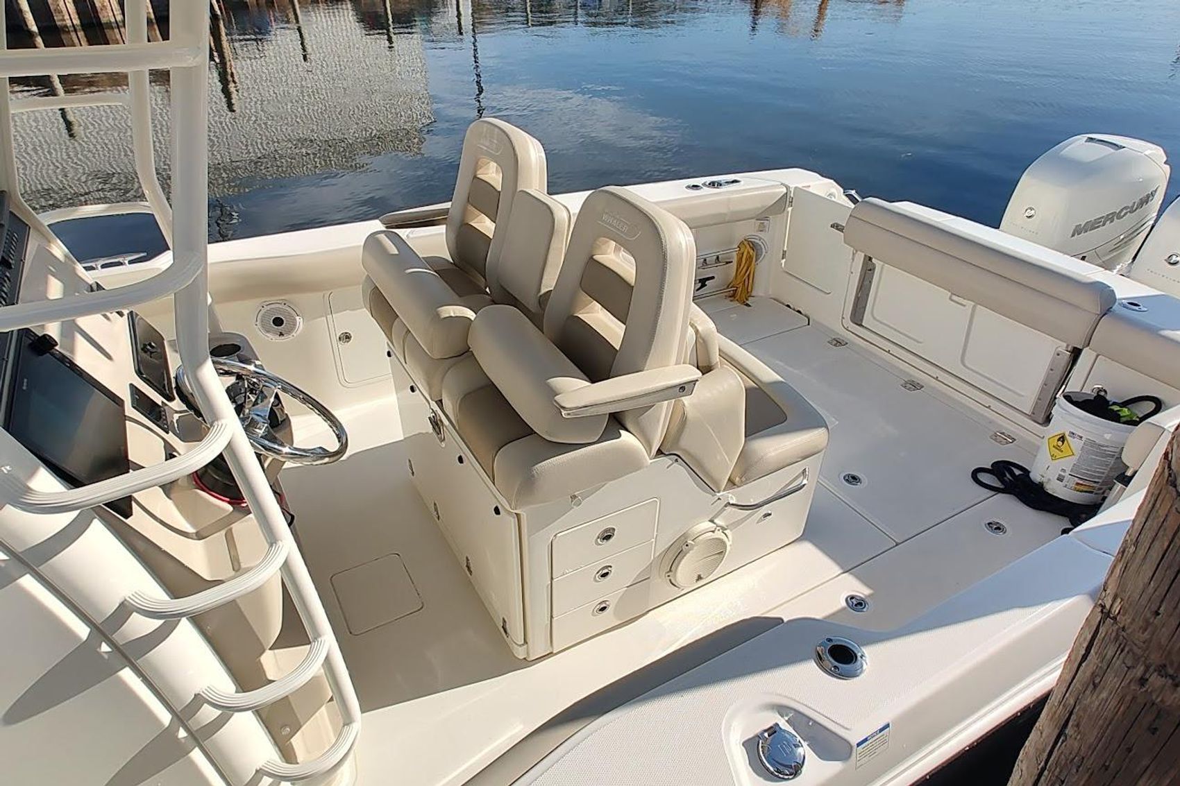 - Port aft storage at fishing prep area (can store a 5 gallon bucket)