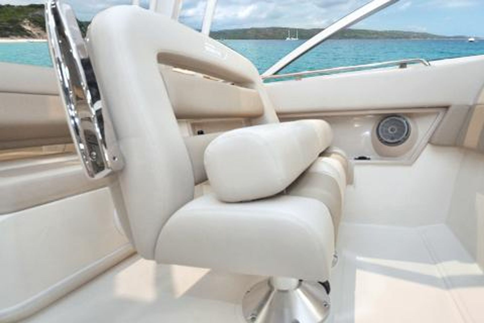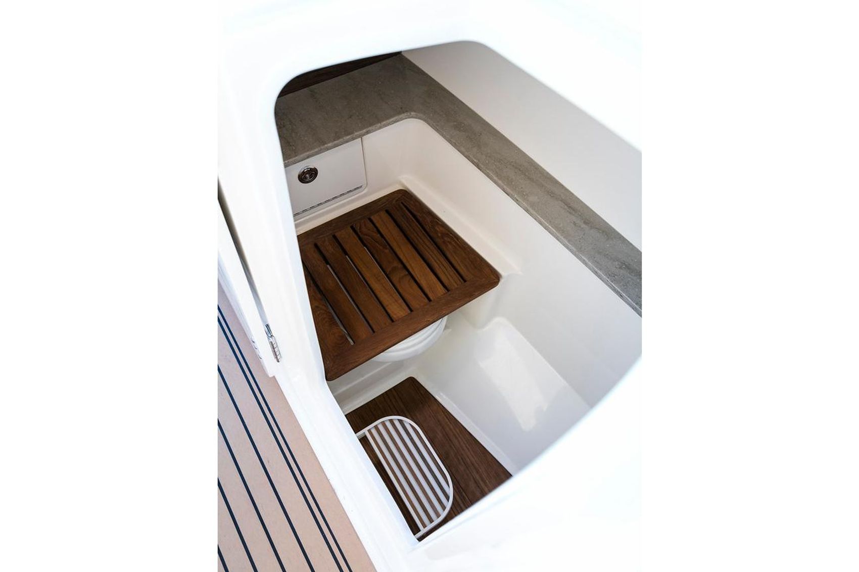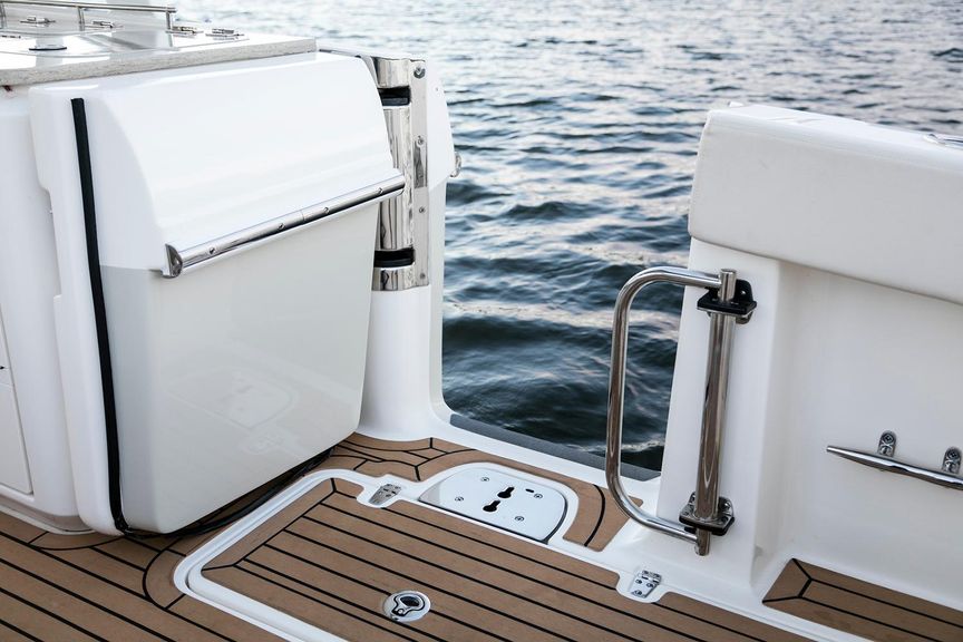 - A cockpit utility center includes a sink, 18-gallon cooler and prep surface, plus optional grill and fridge.