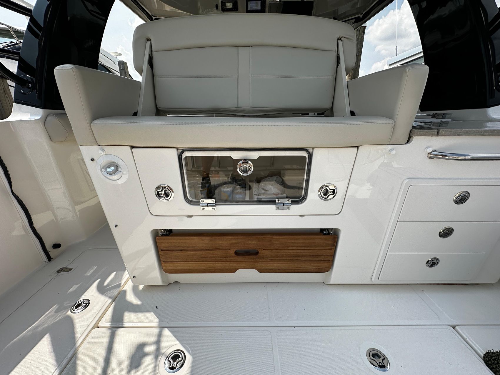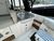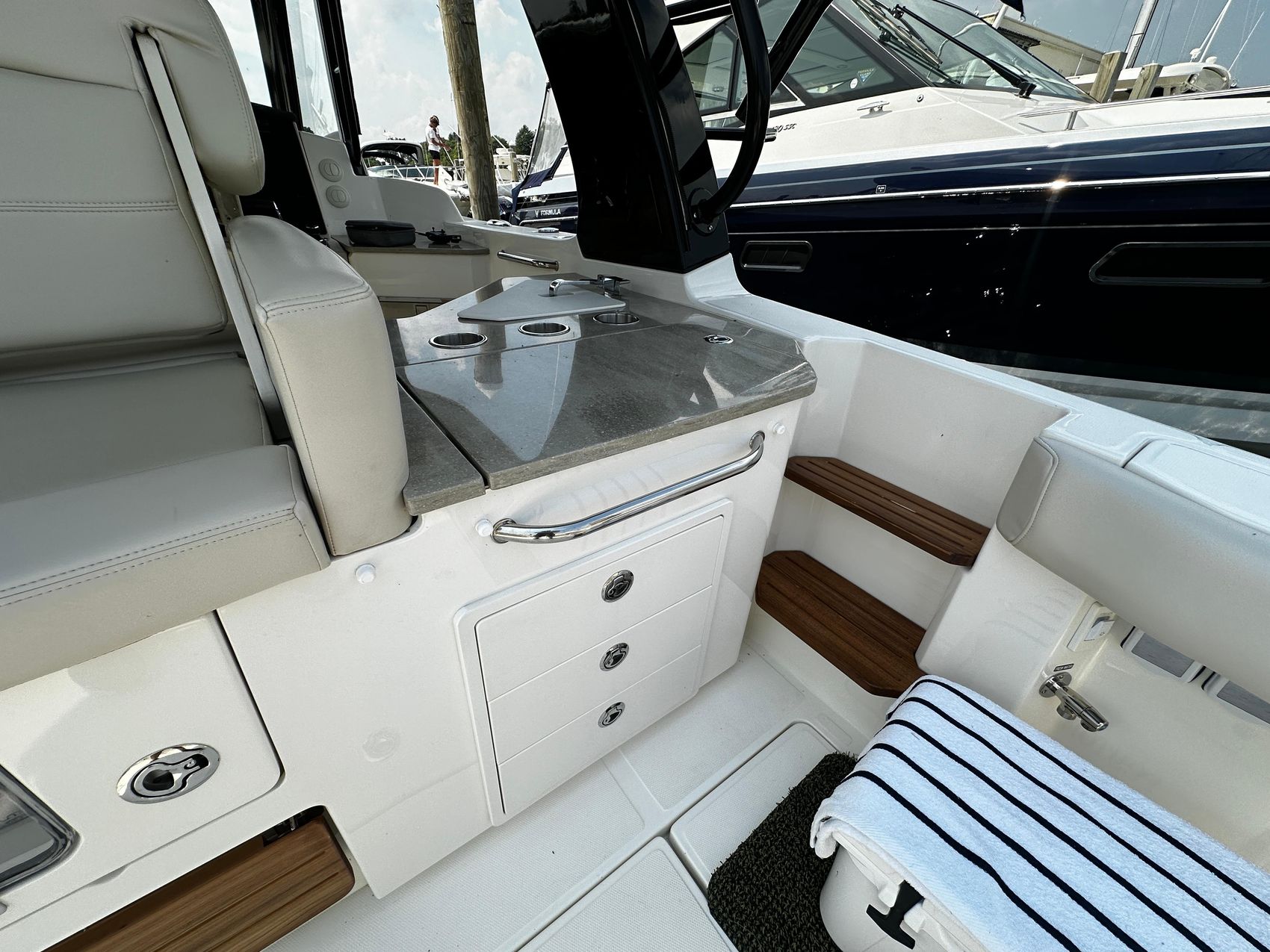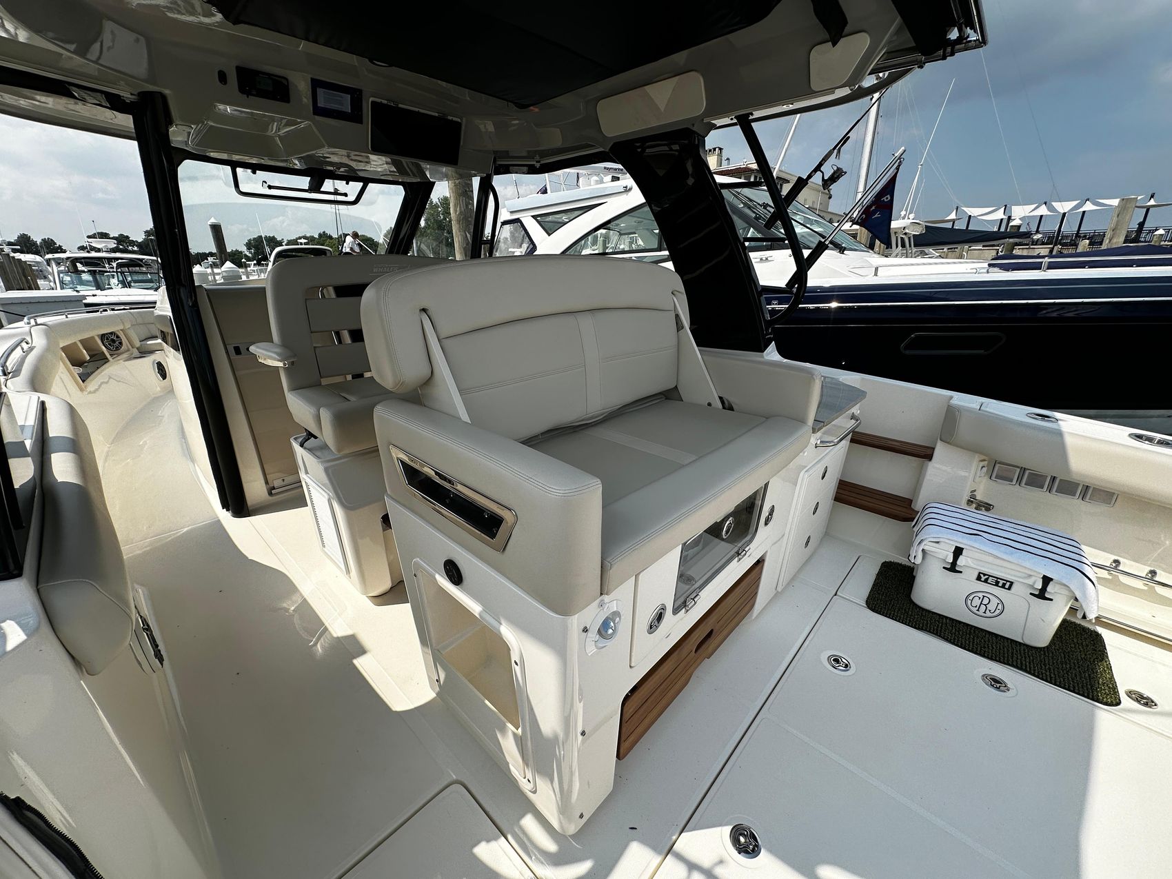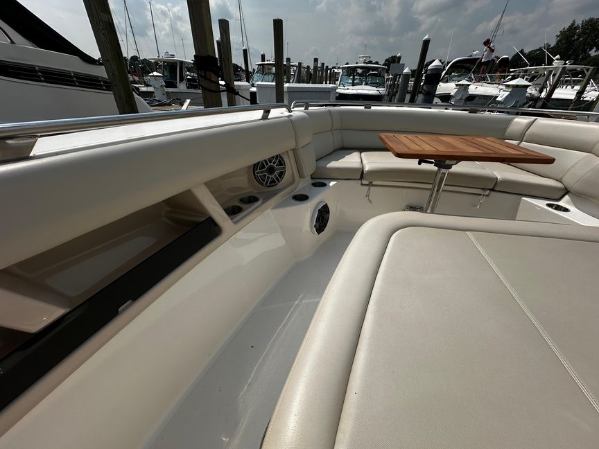 - Robust forward console lounge includes fold-down armrests and drink holders, with forward island deck seating opposite.