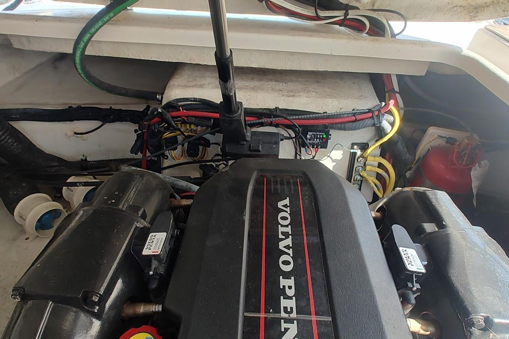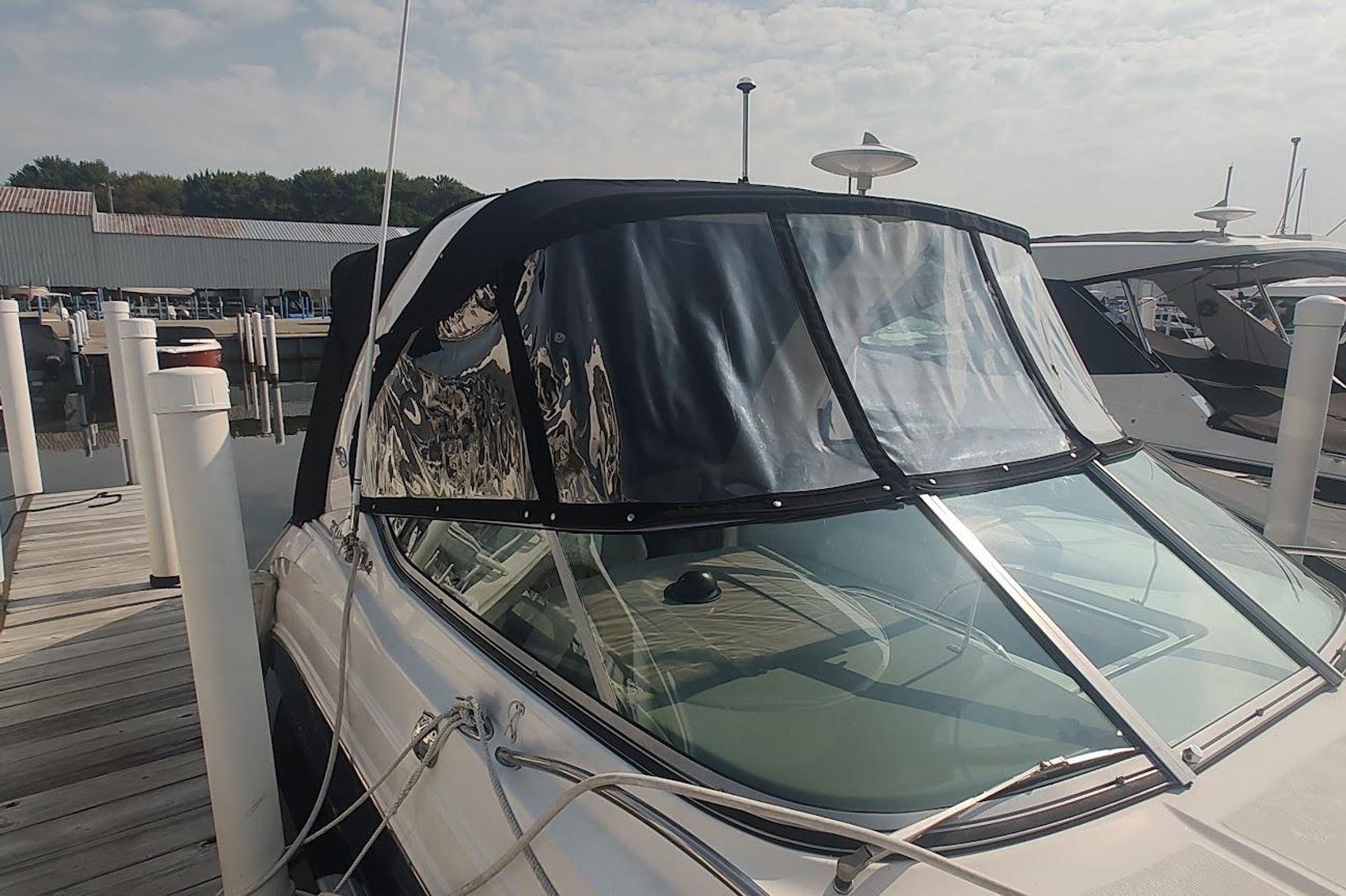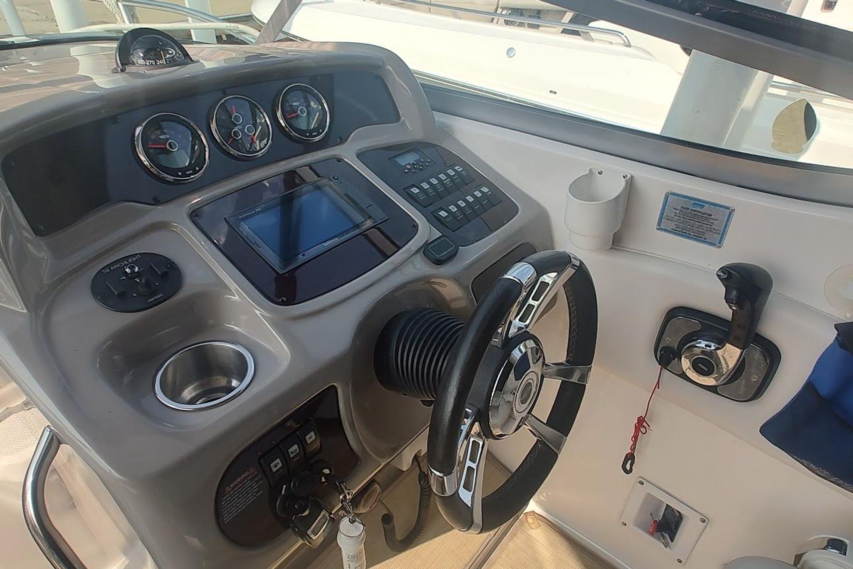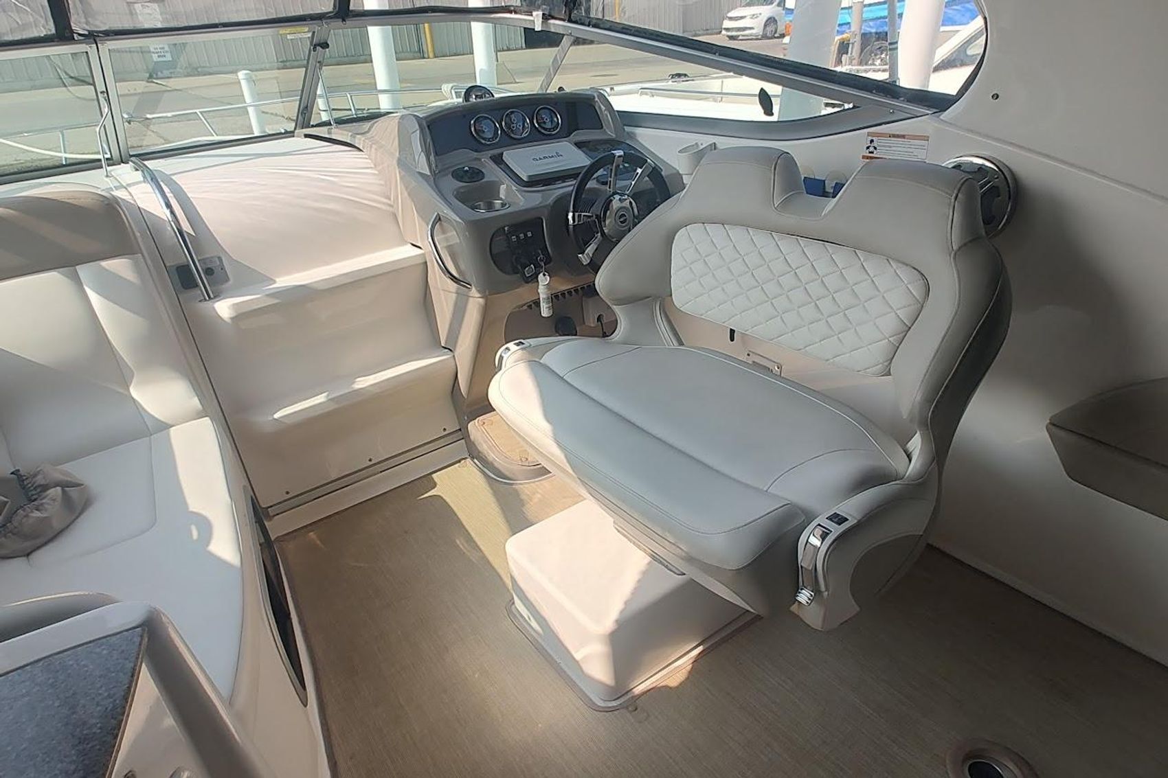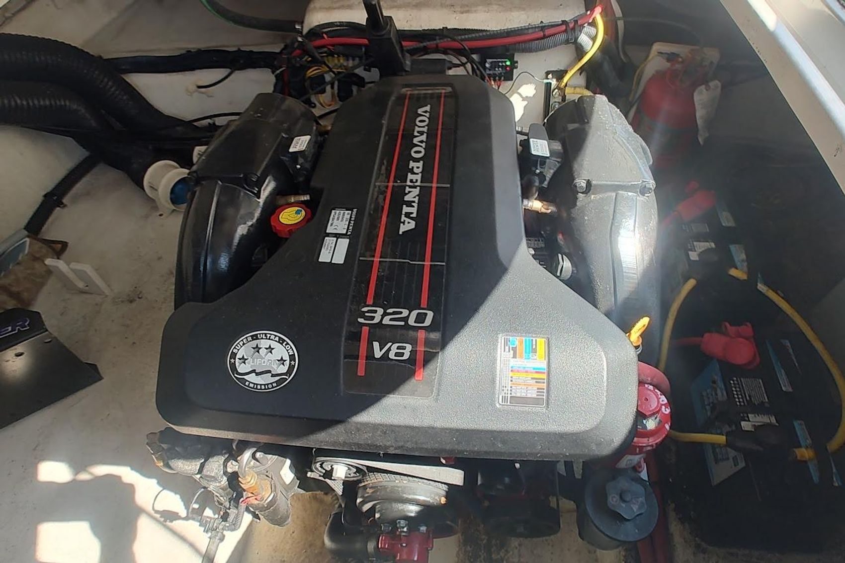 This is a great boat for a young family , options include a powerful V-8 320 HP Dual prop Volvo Penta , Walk through windsheild , Air & Heat , Full Bimini top with enclosure , Garmin Plotter and Windlass..