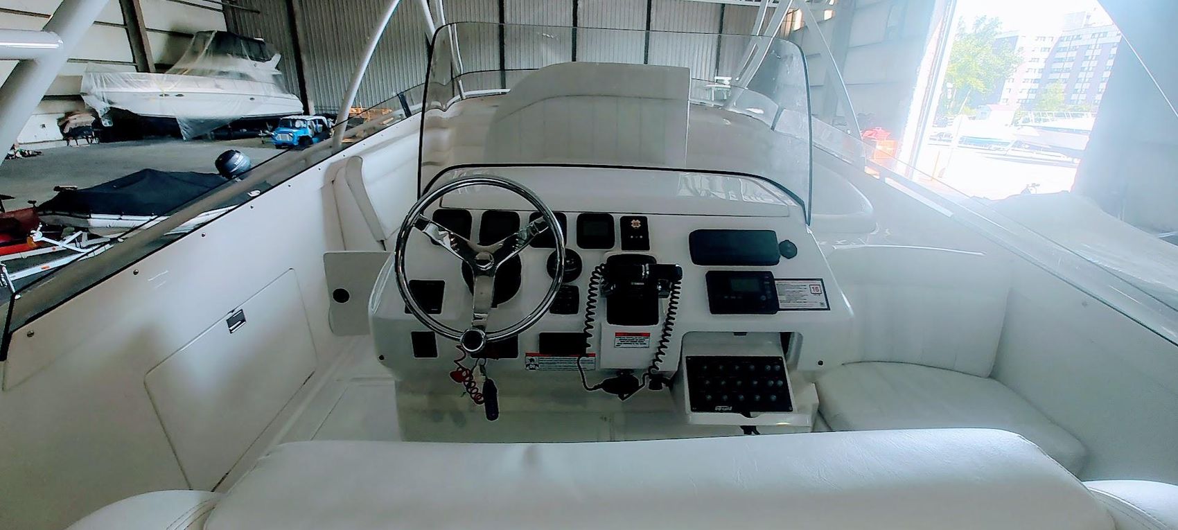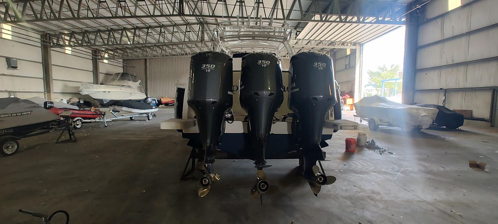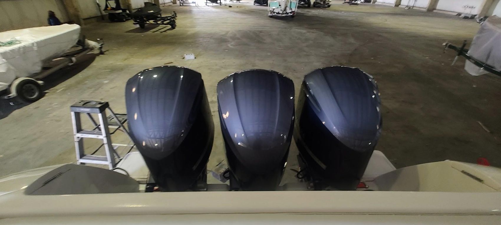 In the water and ready to go..Powered with the upgraded and optional triple F-350’s Yamaha’s , Bow Thruster , Full hardtop with seat covers , Radar , plotter and fish-finder ..