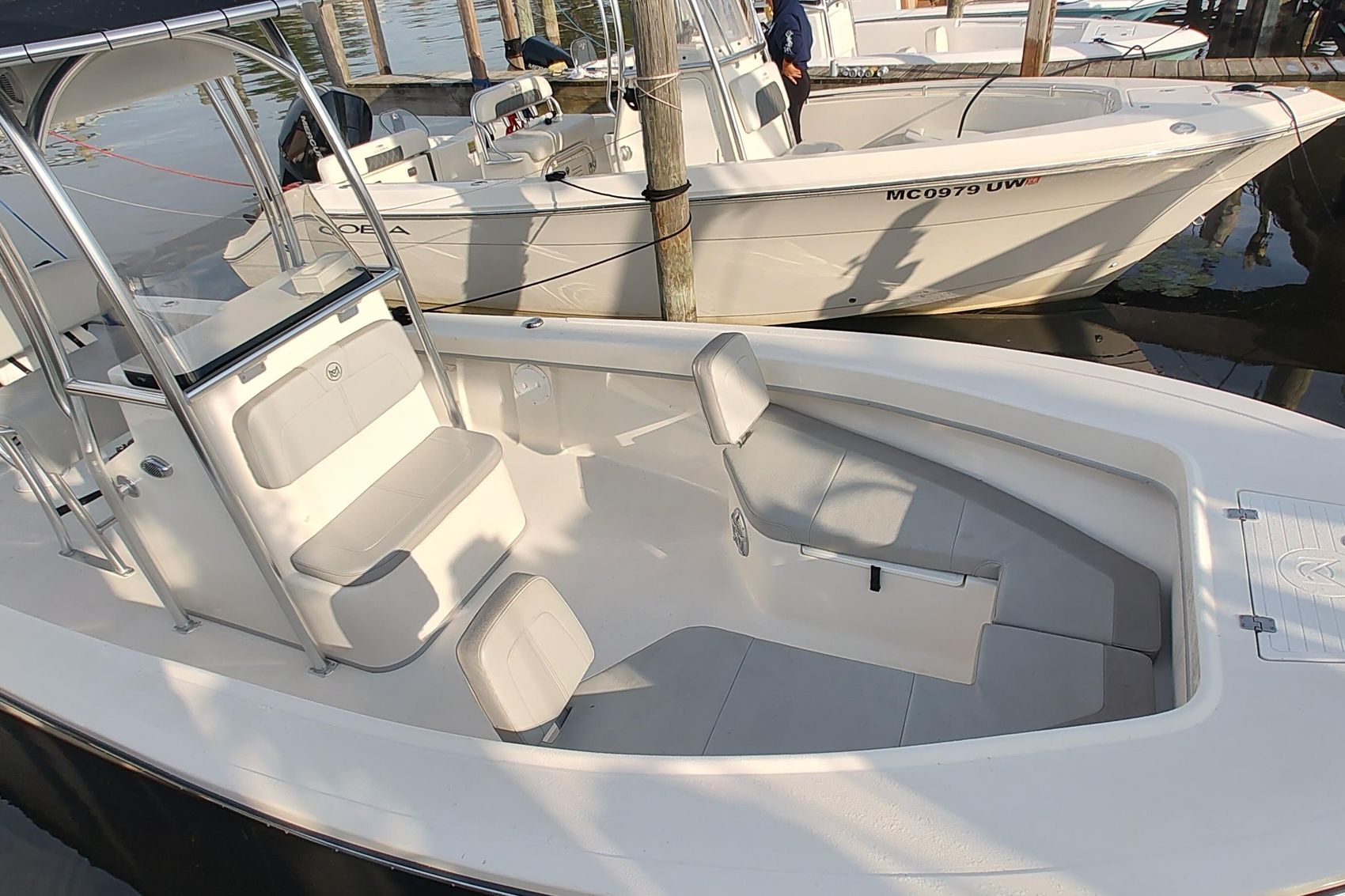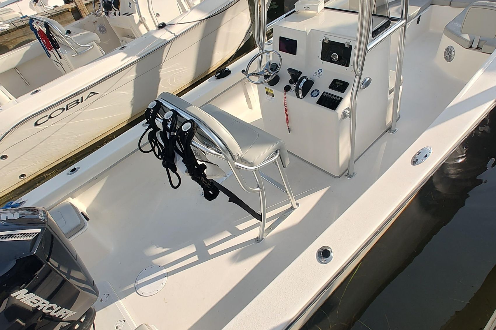 The 2024 MayCraft 238 Center Console is a versatile and robust vessel built for both serious anglers and family outings. Measuring 23 feet in length with an 8-foot beam, it features a deep-V fiberglass hull for smooth rides and stability. Powered by a Mercury 200XL FourStroke engine, it delivers impressive speed and fuel efficiency. Standard amenities include a stainless steel T-top with rod holders, SIMRAD touchscreen GPS/fishfinder, hydraulic steering, livewell, and U-shaped bow seating with removable backrests—making it equally suited for coastal cruising or chasing trophy catches.