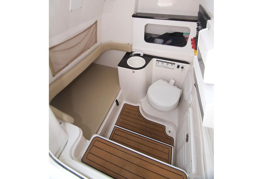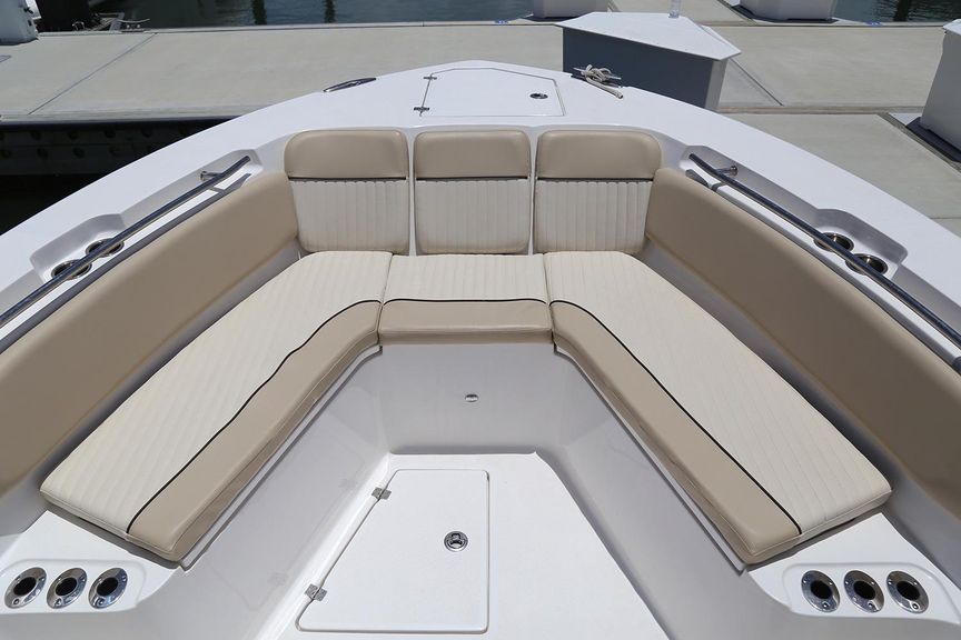Up front, on the 328 Commander, there are two forward-facing lounges with flip-out backrests set into the bow, and a large backrest means another person can join in and face aft in a smaller bench seat. Drop a table in, and happy hour is complete. Ahead of the center console is an expansive two-person, forward-facing lounge with more stowage underneath. The interior of the center console is outfitted with an electric head, sink, and a padded area that most folks will used as rod and tackle stowage but can also serve as a berth.