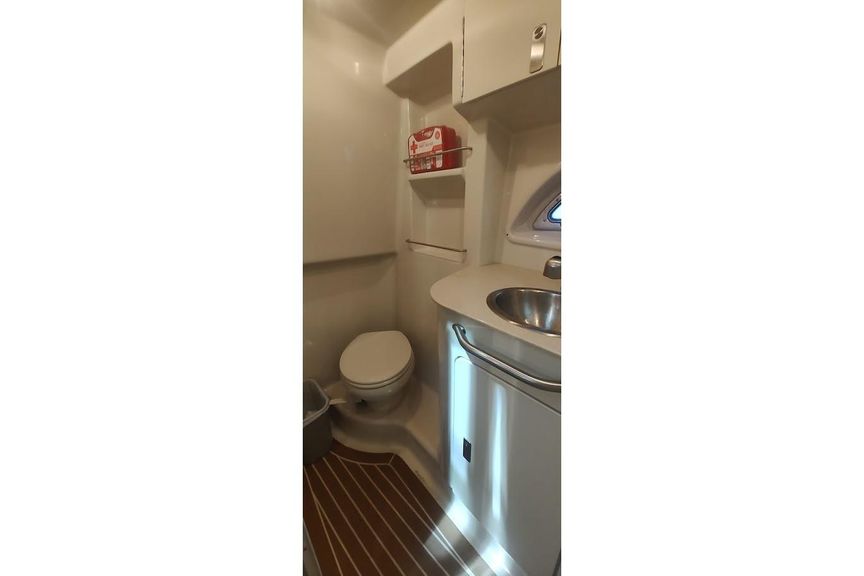 - Large enclosed head compartment with simulated teak flooring.
