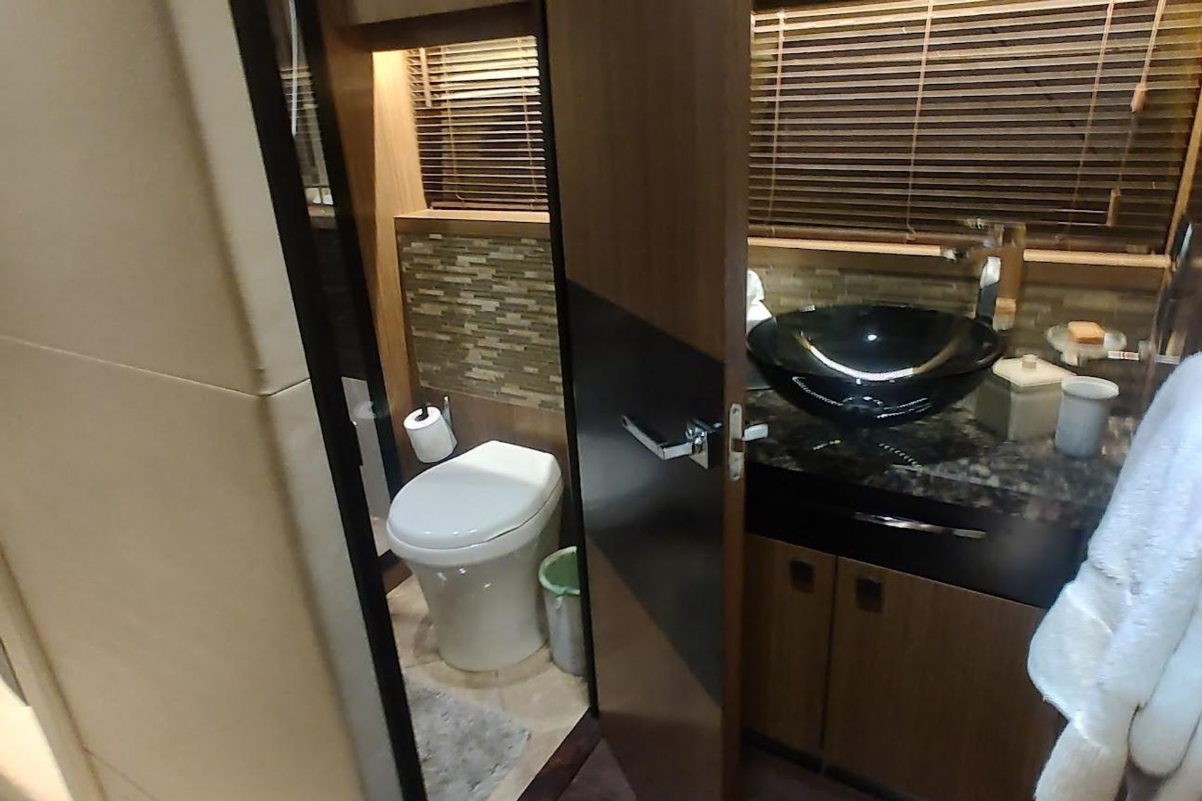 • Vanity w/Solid Surface Countertop, His & Her Vessel Sinks, Faucets, Storage & Trash Receptacle