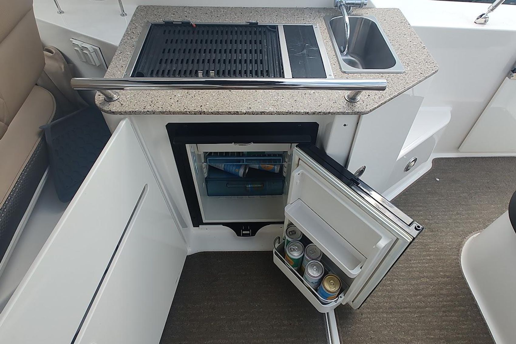 • Wet Bar w/Solid Surface, Stainless Steel Sink & Faucet, Beverage Holders, Stainless Steel Handrail & Storage Below
