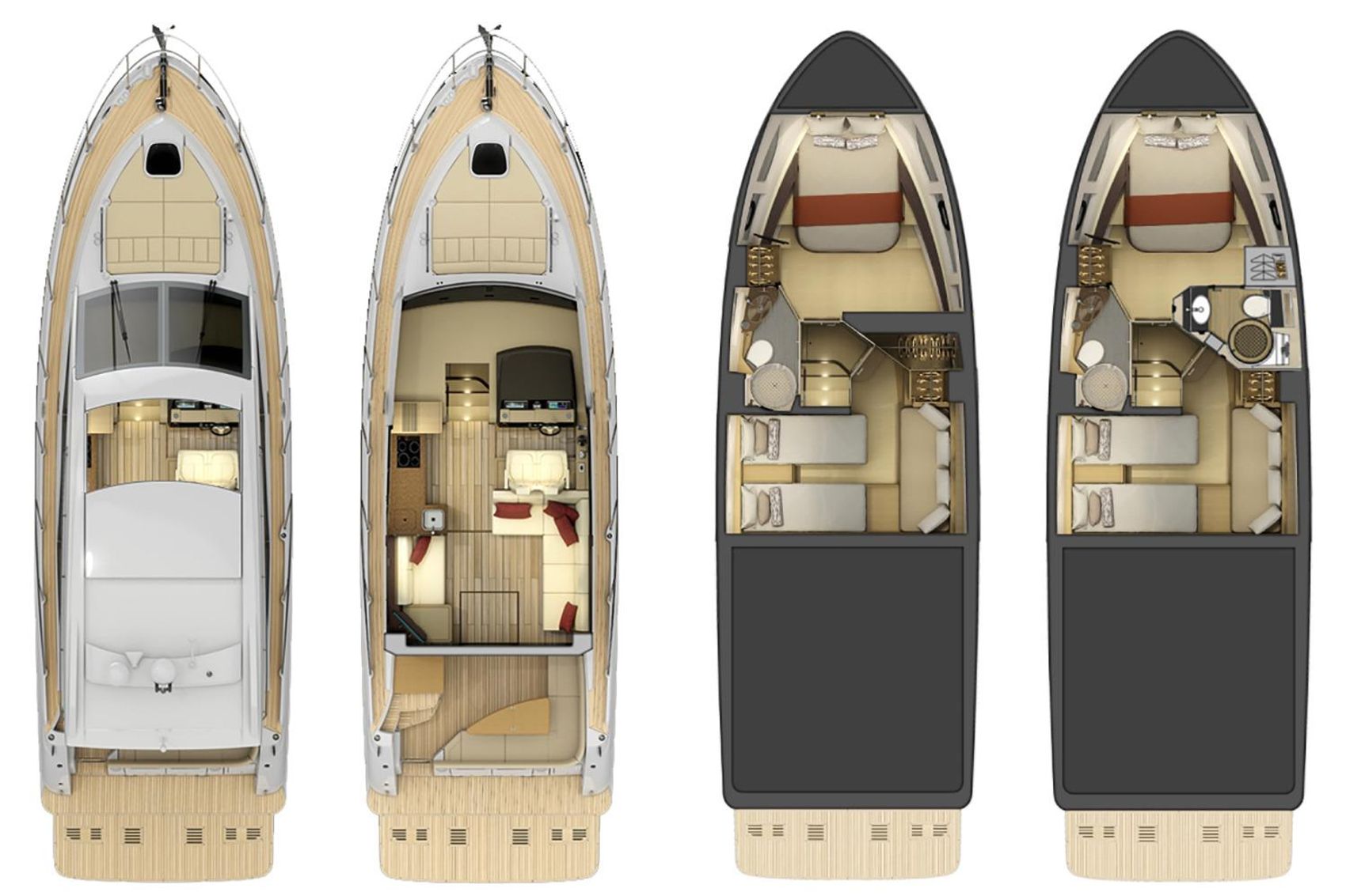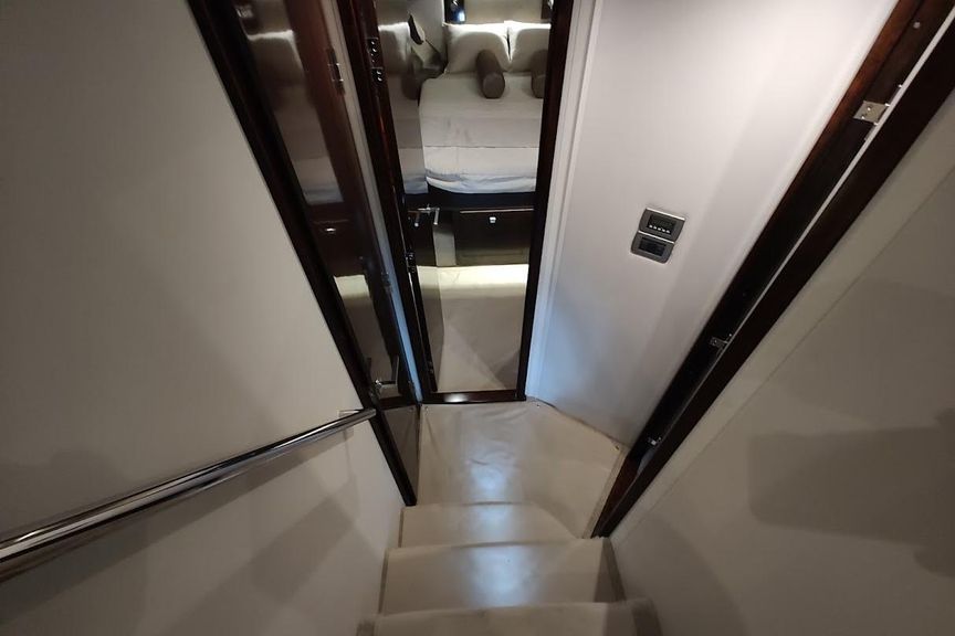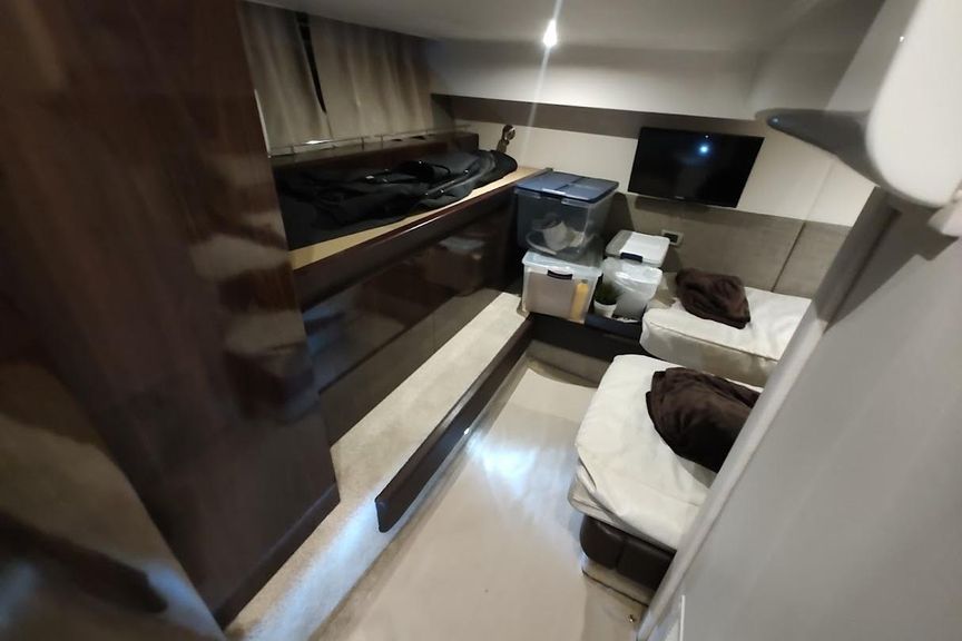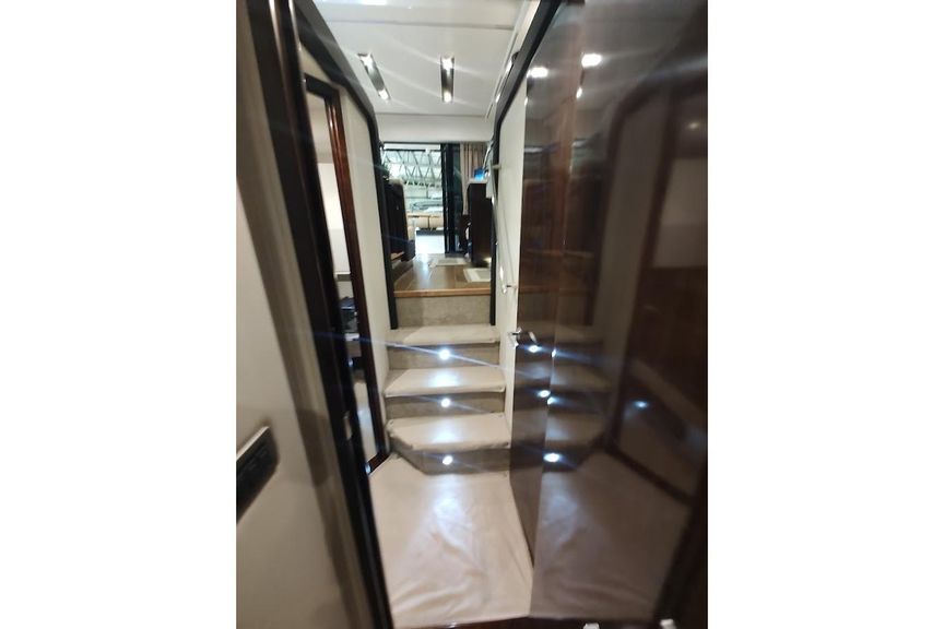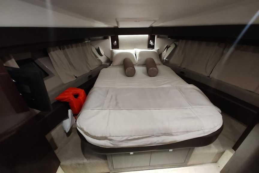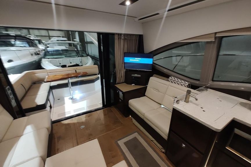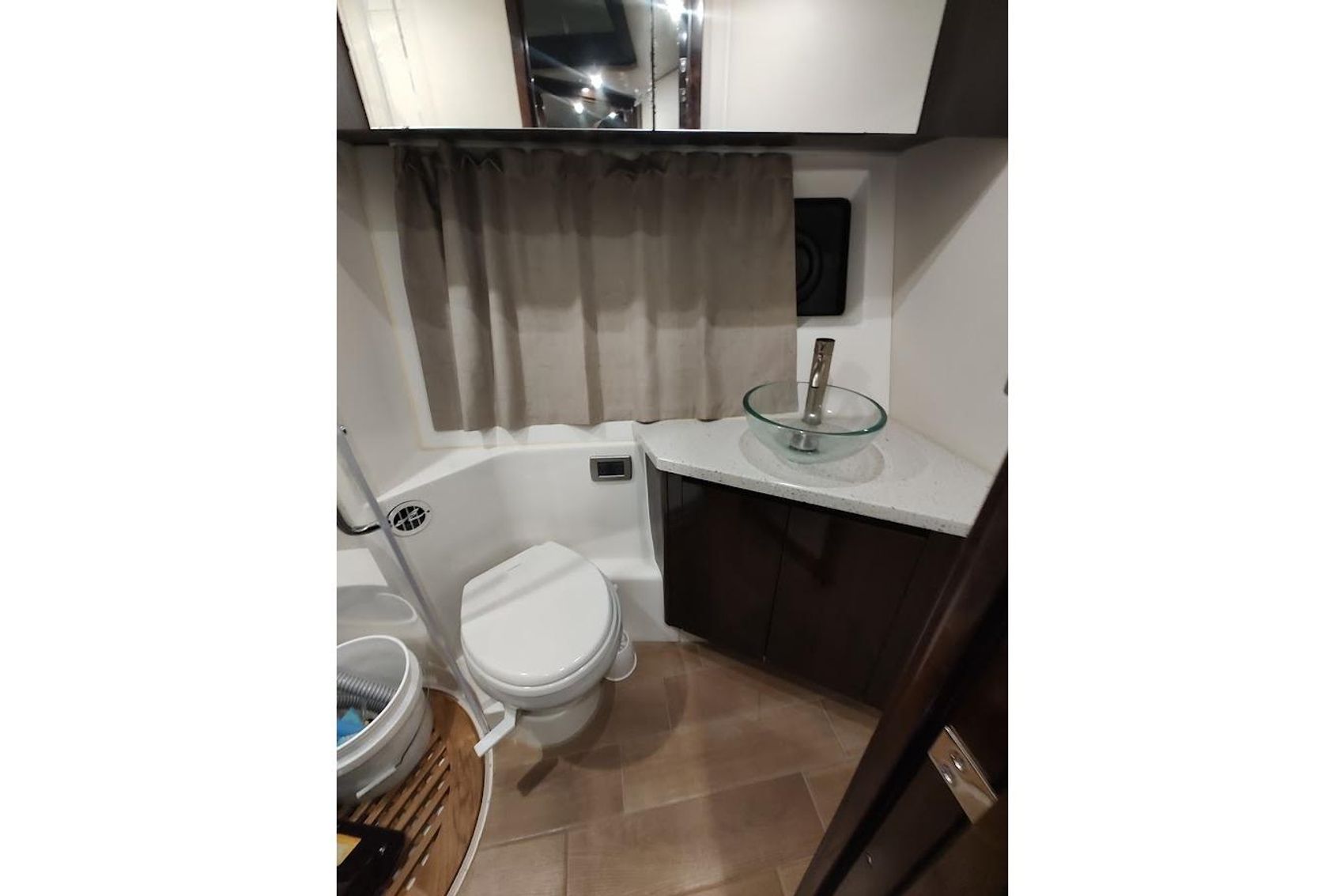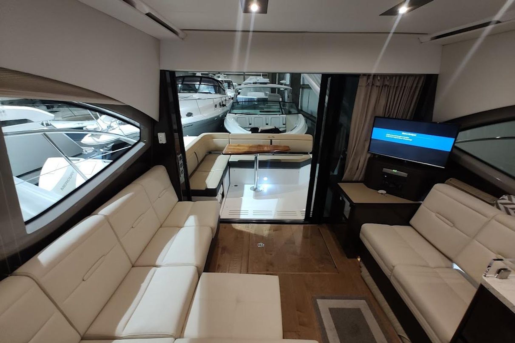 The layout includes a The rare and hard to find 15k optional 2 head layout snd bright salon with large windows, a full galley, a forward master stateroom, and a mid-cabin lounge that converts for extra sleeping space. Additional highlights include a residential-style head with 2 separate shower and optional 35k Hydraulic swim platform and full electric Sunshade off the rear cockpit . This low-hour, dealer maintained Sport Yacht is one of a kind and shows like new ..